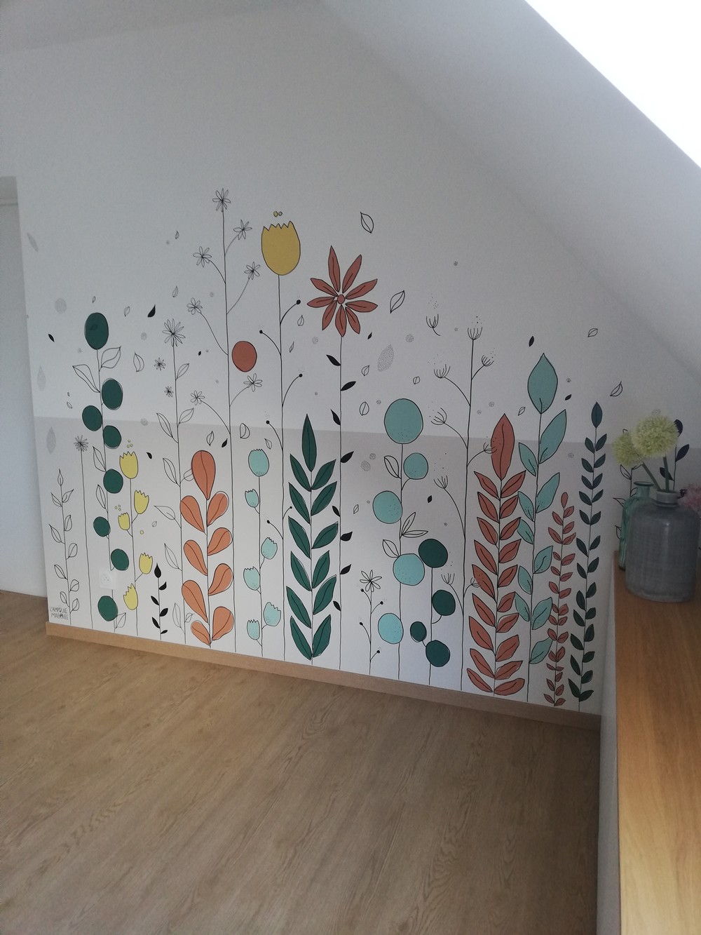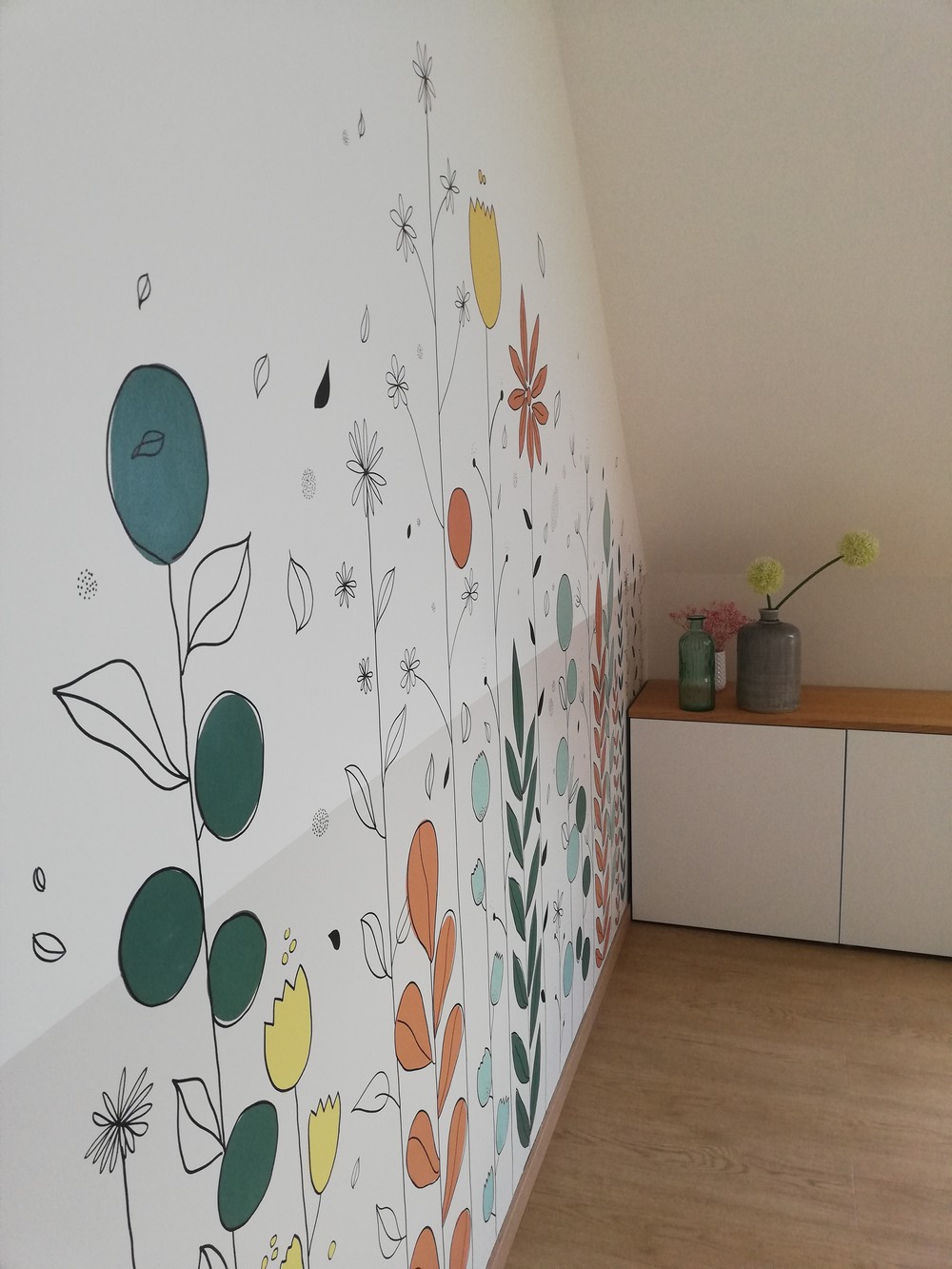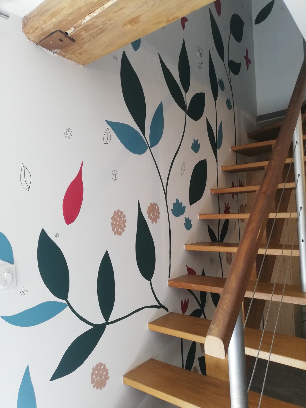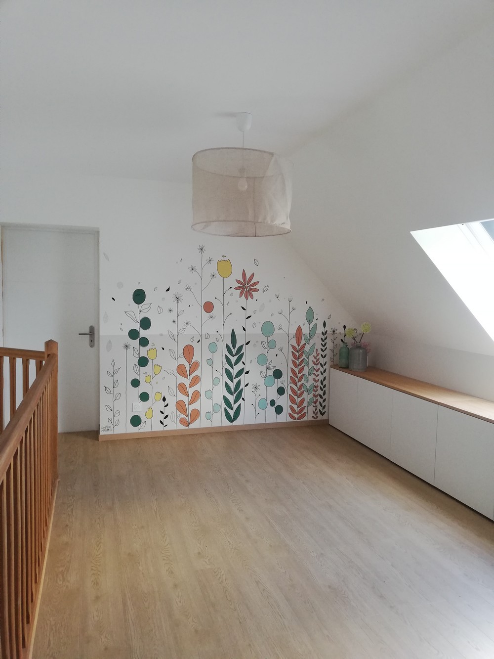 Claire et son mari redécore la maison achetée il y a quelques mois. Des peintures blanches ont été appliquées dans toutes les pièces. Il fallait maintenant y ajouter quelques notes de couleur. Claire a choisi pour cette fresque des motifs de fleurs avec des coloris doux pour « réchauffer » l’espace mezzanine.