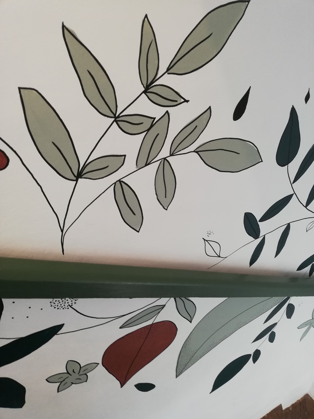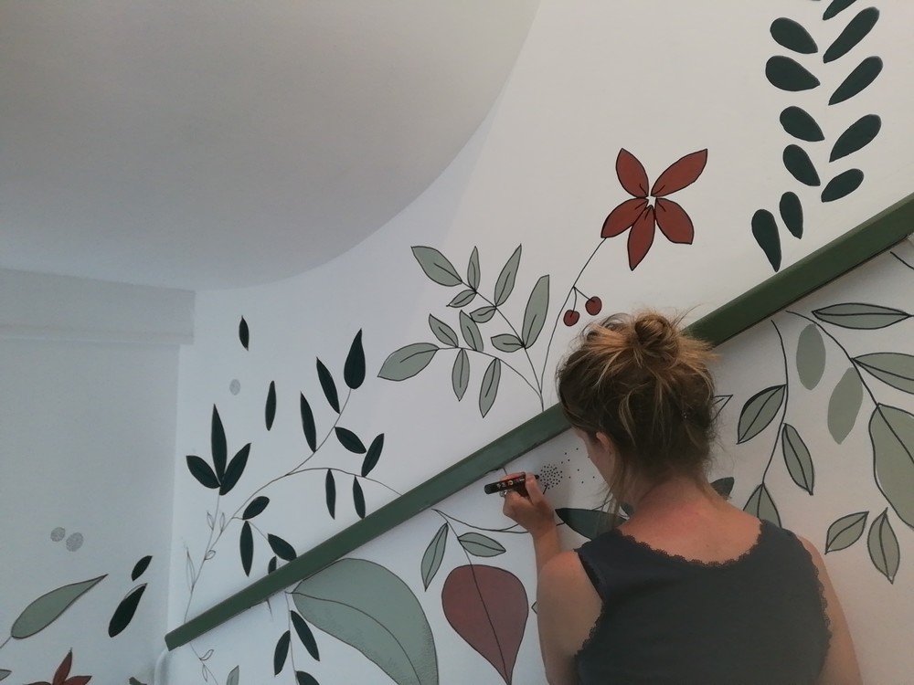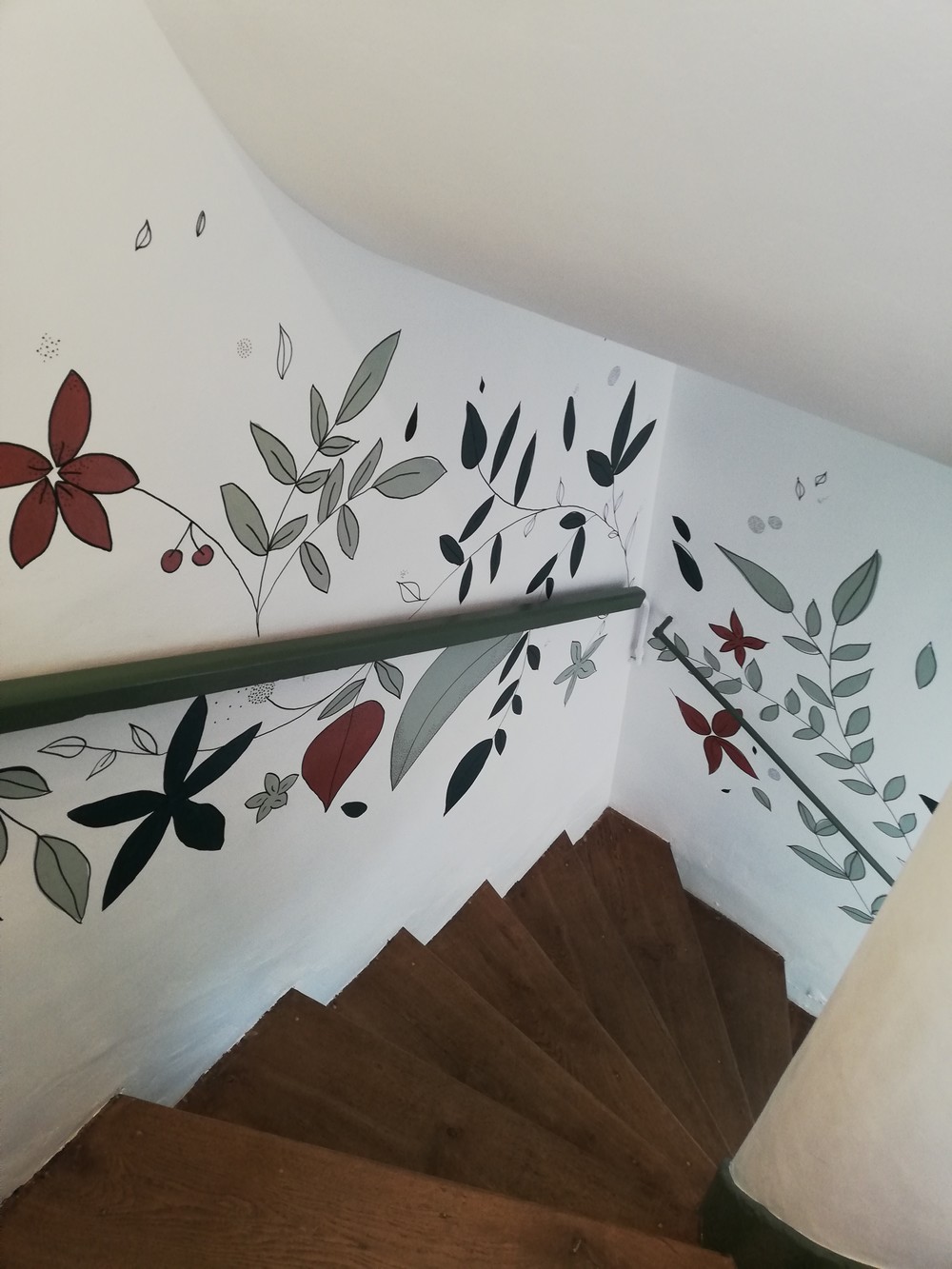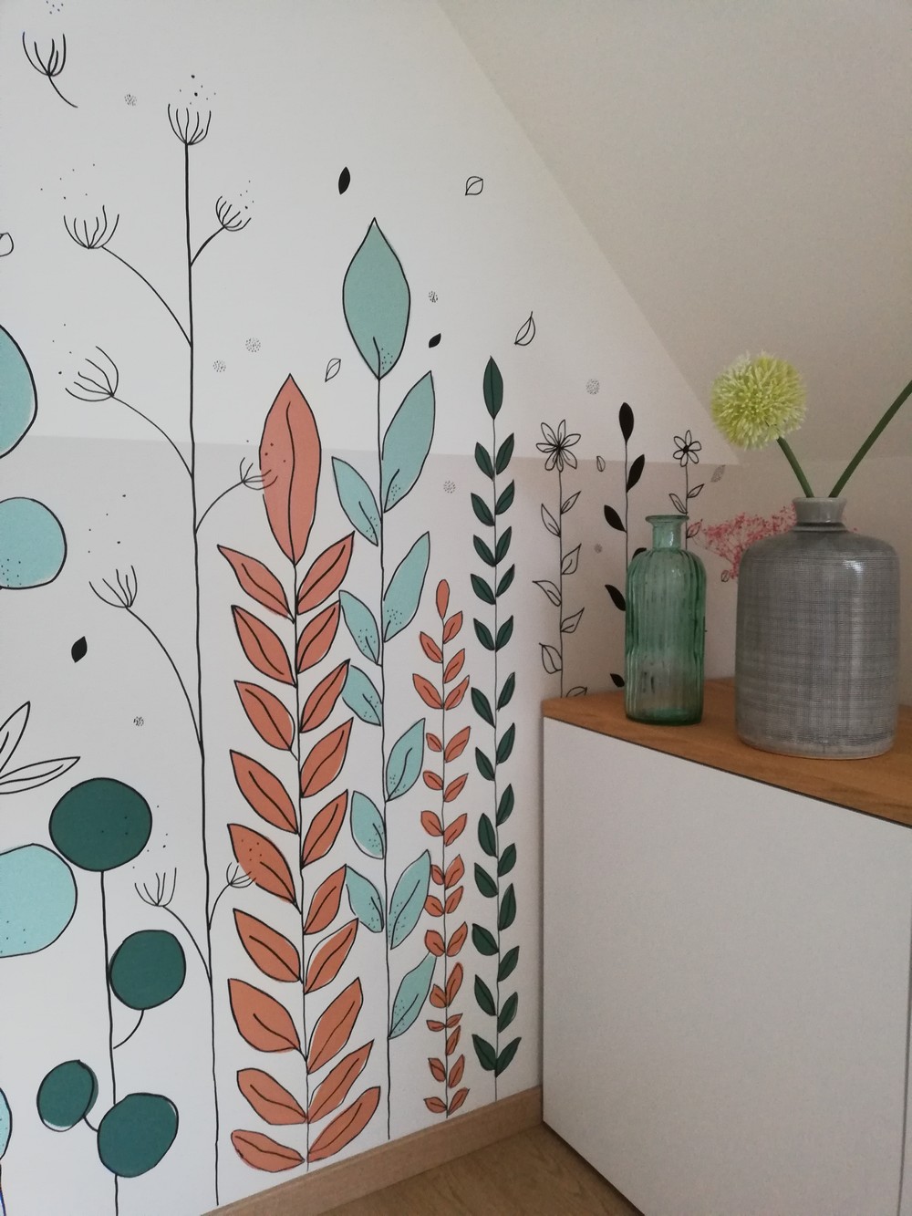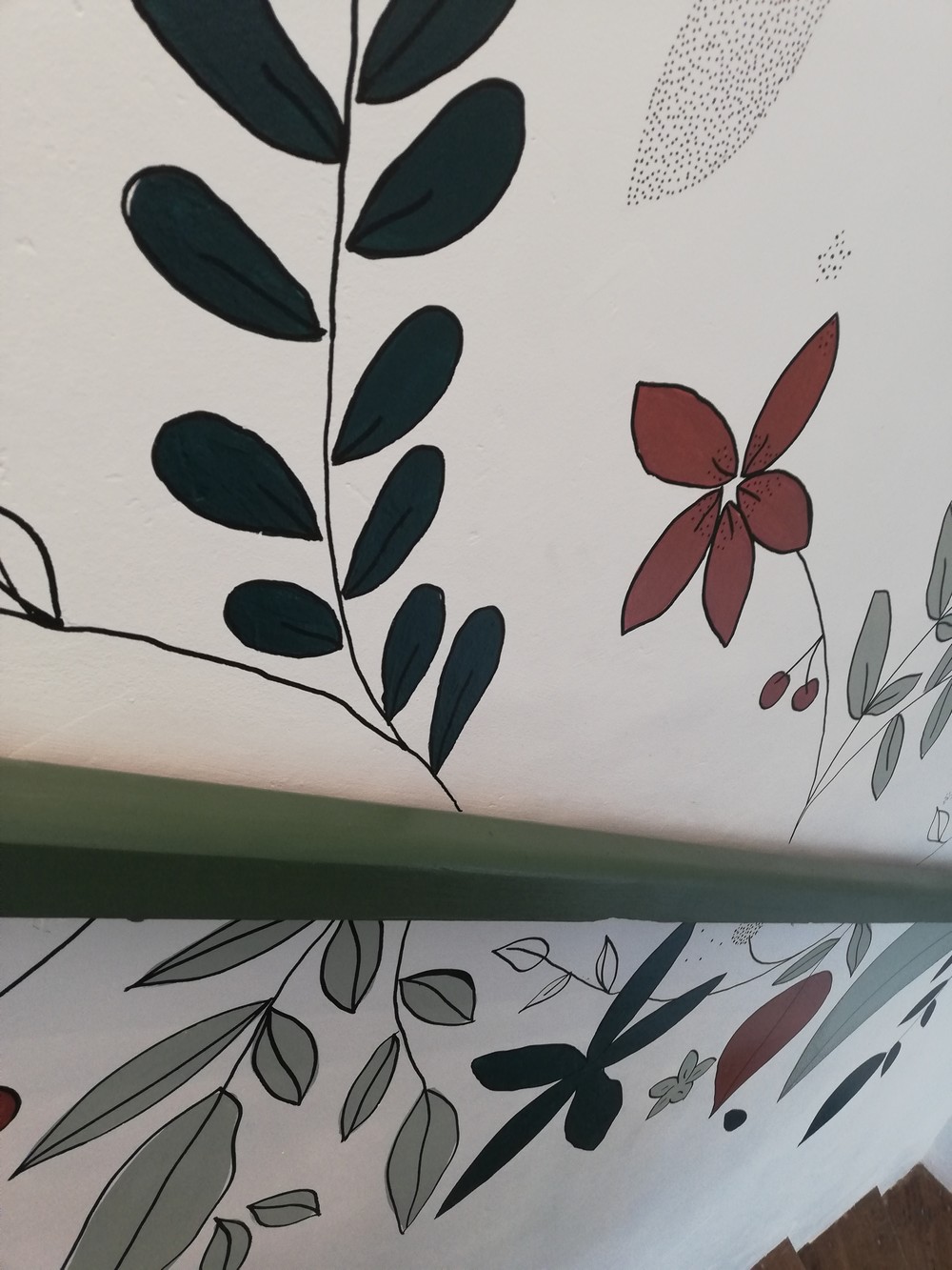 Claire et son mari redécore la maison achetée il y a quelques mois. Des peintures blanches ont été appliquées dans toutes les pièces. Il fallait maintenant y ajouter quelques notes de couleur. Claire a choisi pour cette fresque des motifs de fleurs avec des coloris doux pour « réchauffer » l’espace mezzanine.