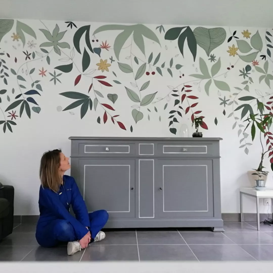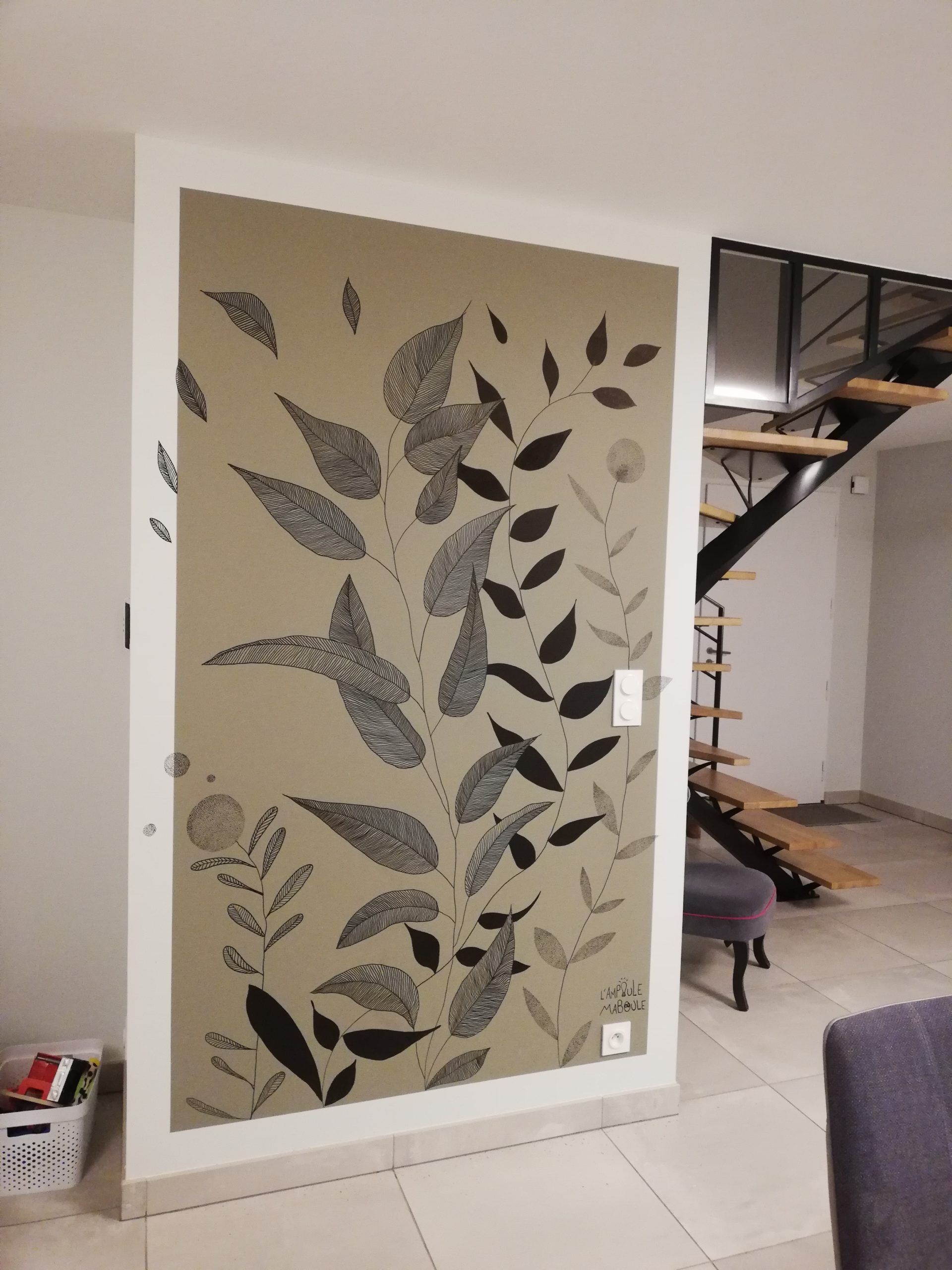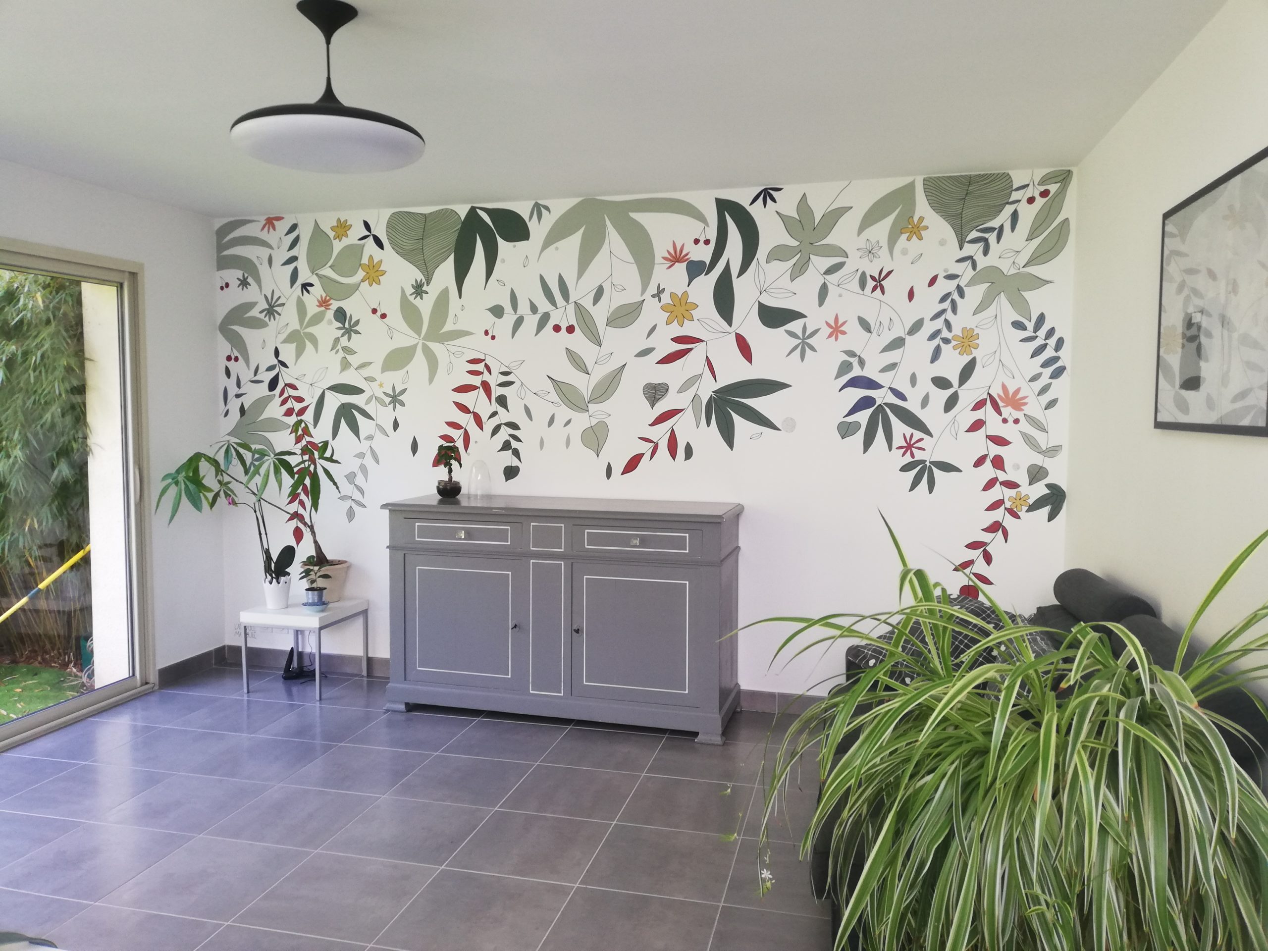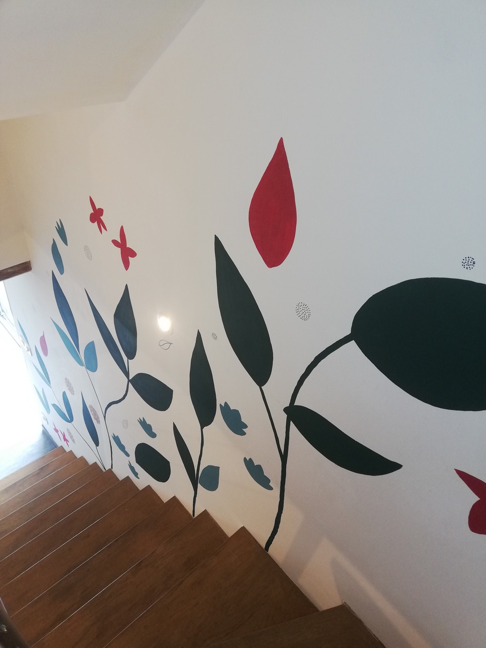 Claire et son mari redécore la maison achetée il y a quelques mois. Des peintures blanches ont été appliquées dans toutes les pièces. Il fallait maintenant y ajouter quelques notes de couleur. Claire a choisi pour cette fresque des motifs de fleurs avec des coloris doux pour « réchauffer » l’espace mezzanine.