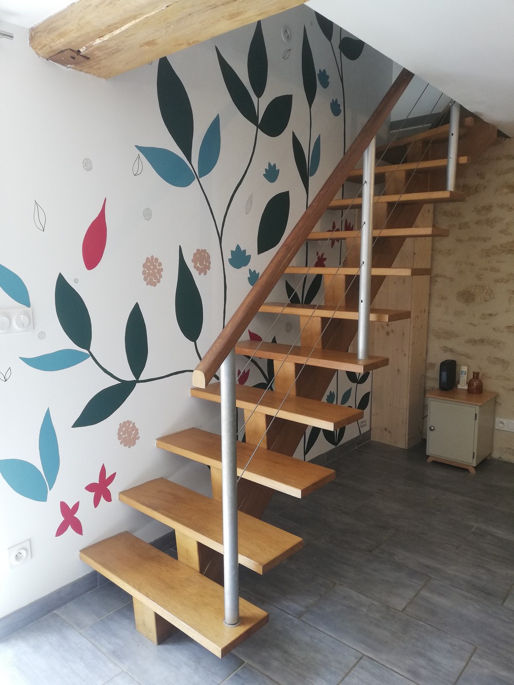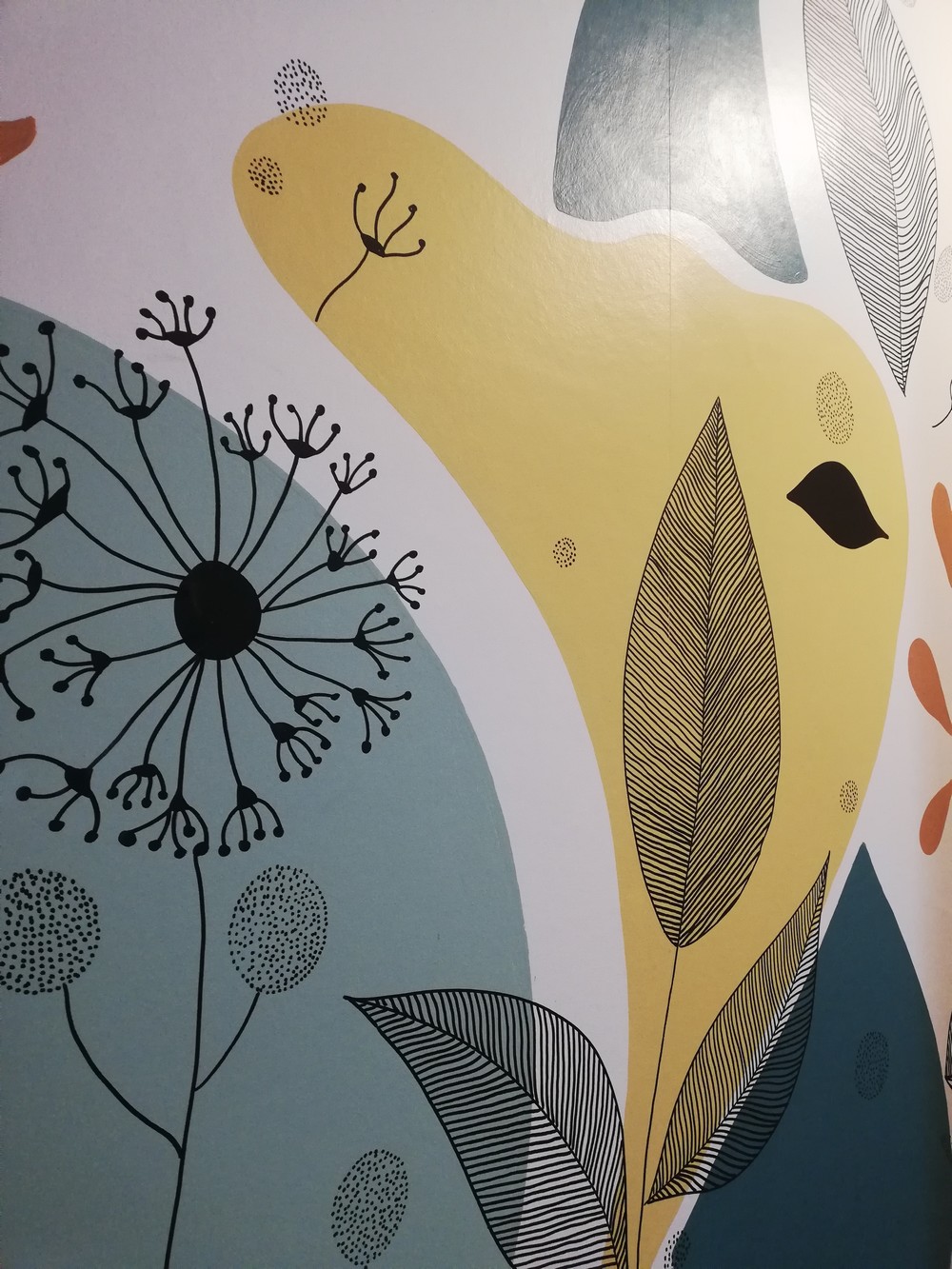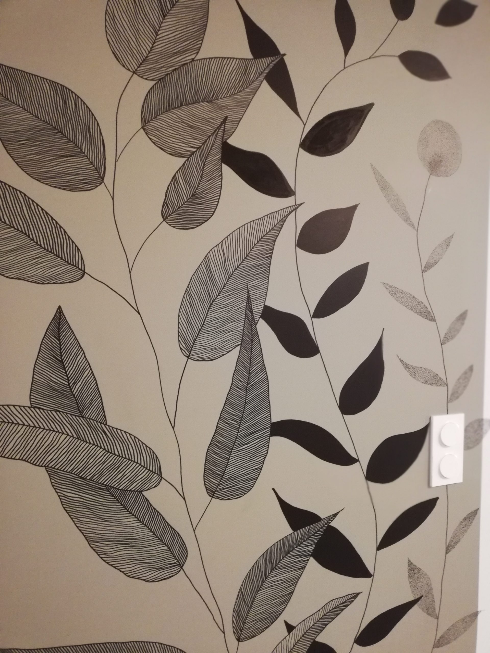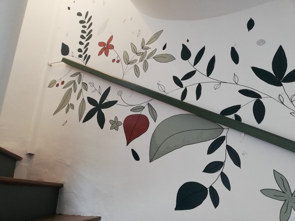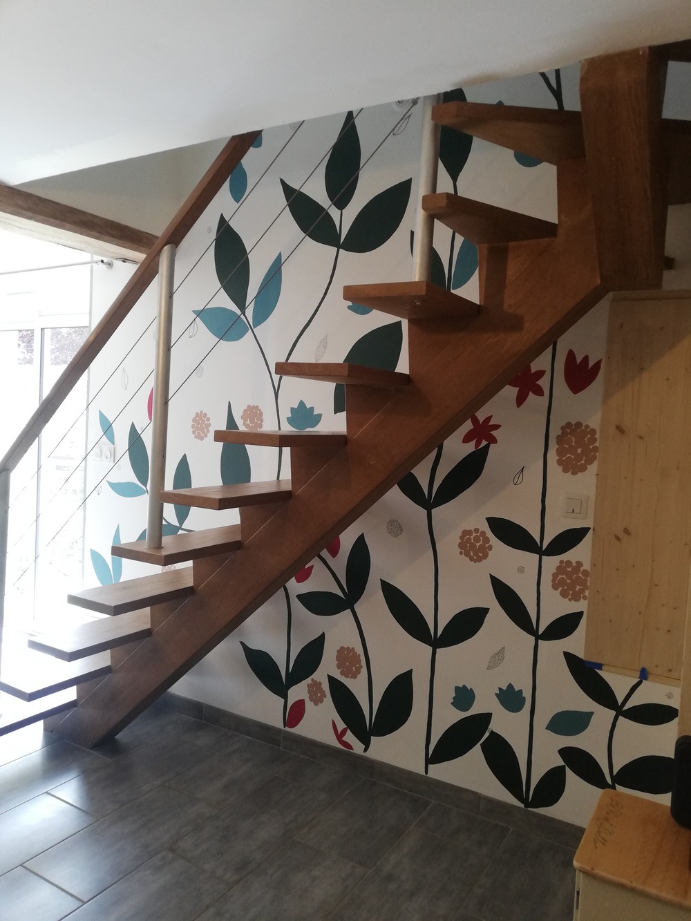 Claire et son mari redécore la maison achetée il y a quelques mois. Des peintures blanches ont été appliquées dans toutes les pièces. Il fallait maintenant y ajouter quelques notes de couleur. Claire a choisi pour cette fresque des motifs de fleurs avec des coloris doux pour « réchauffer » l’espace mezzanine.
