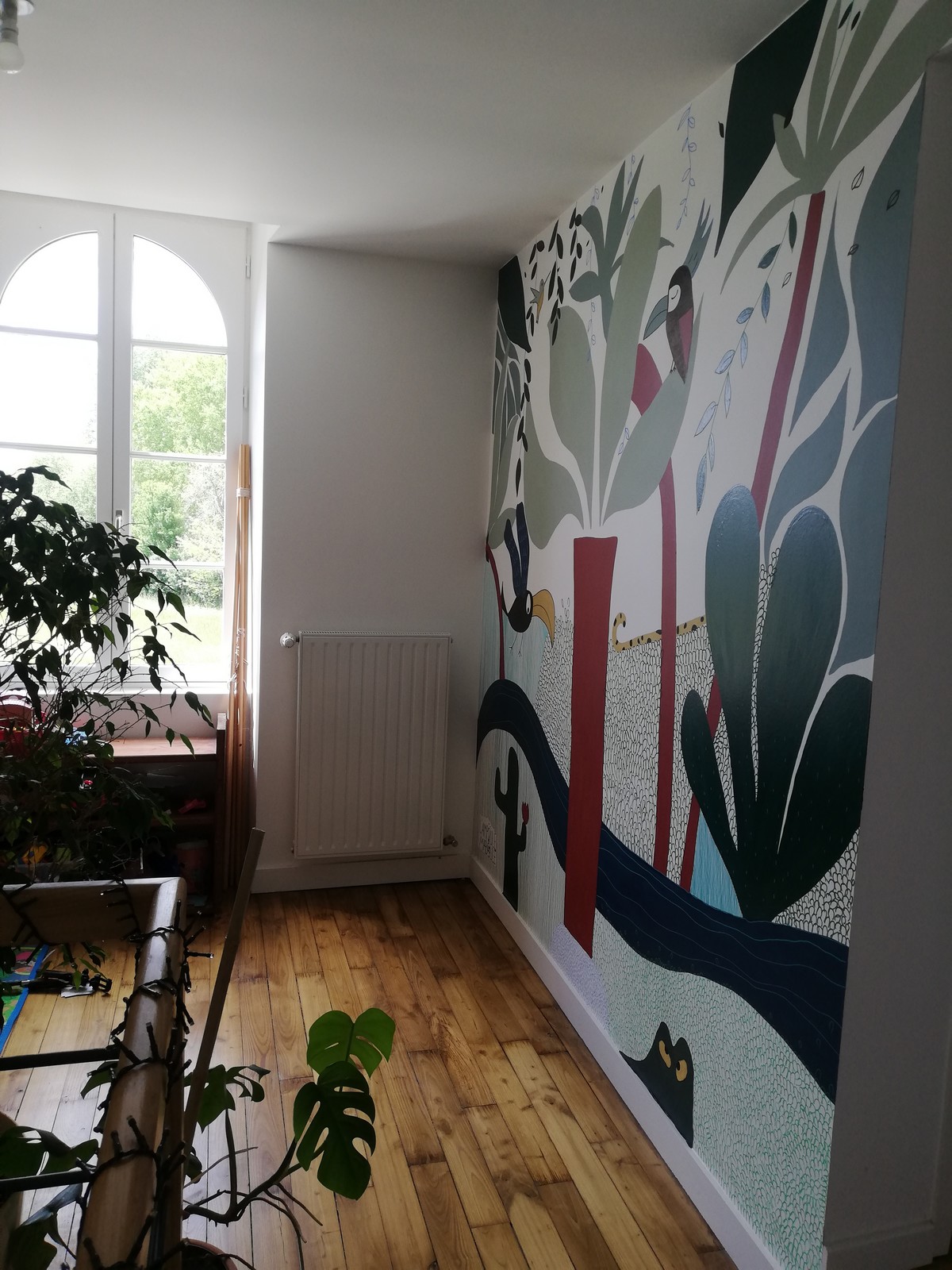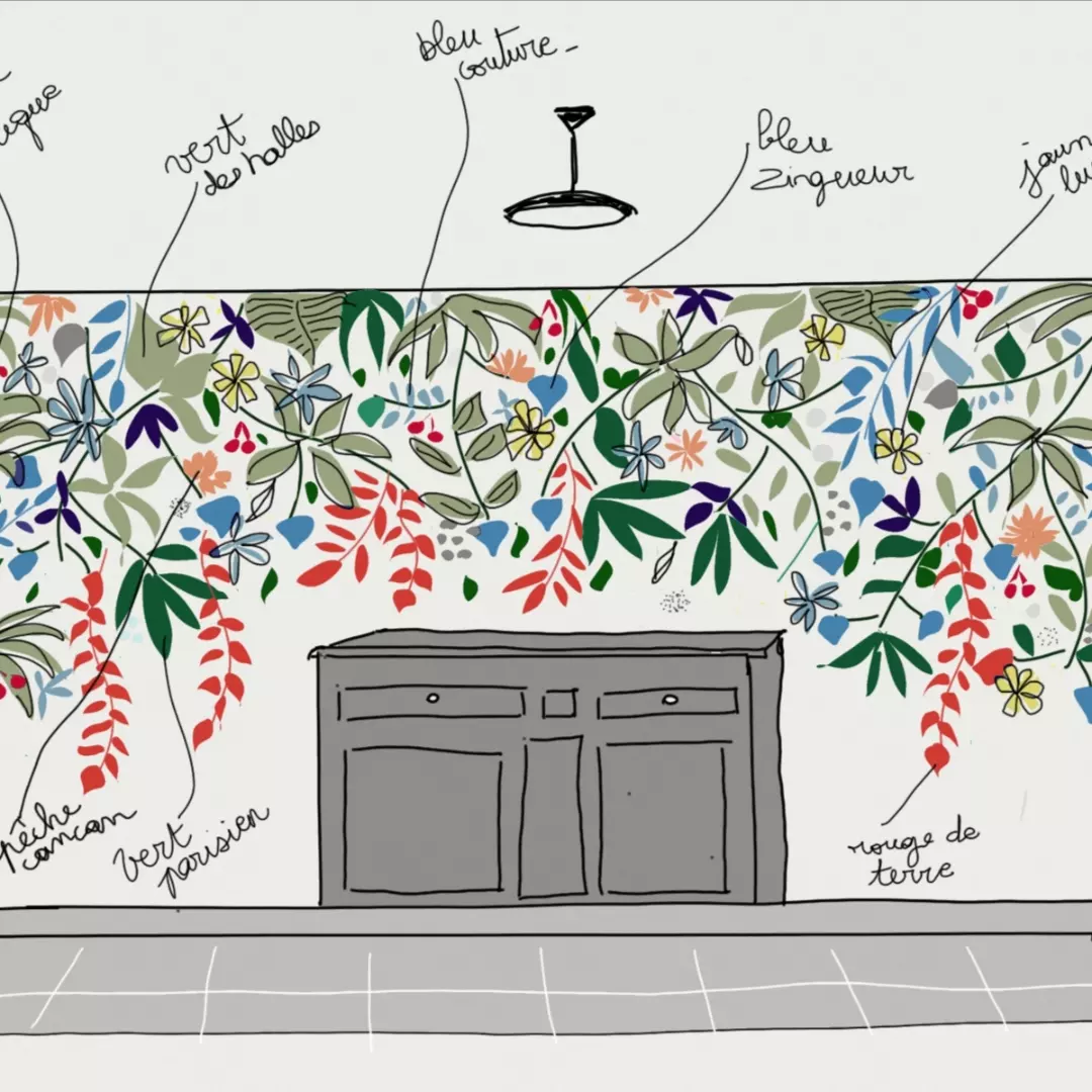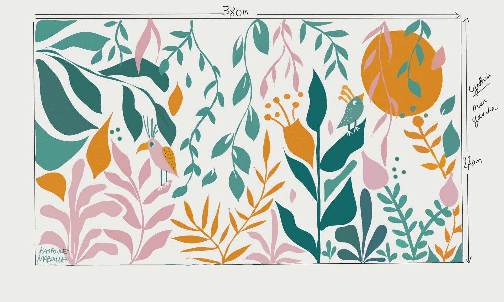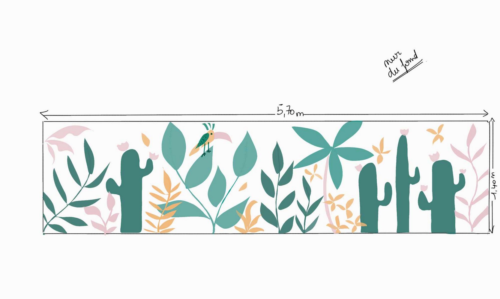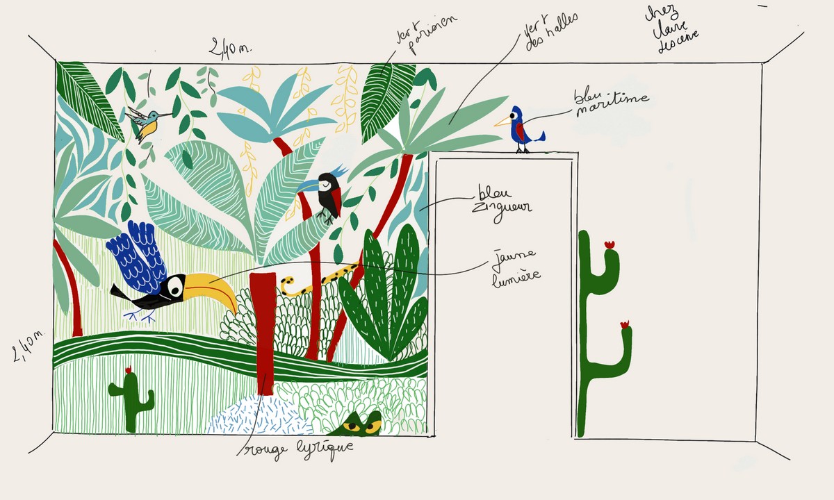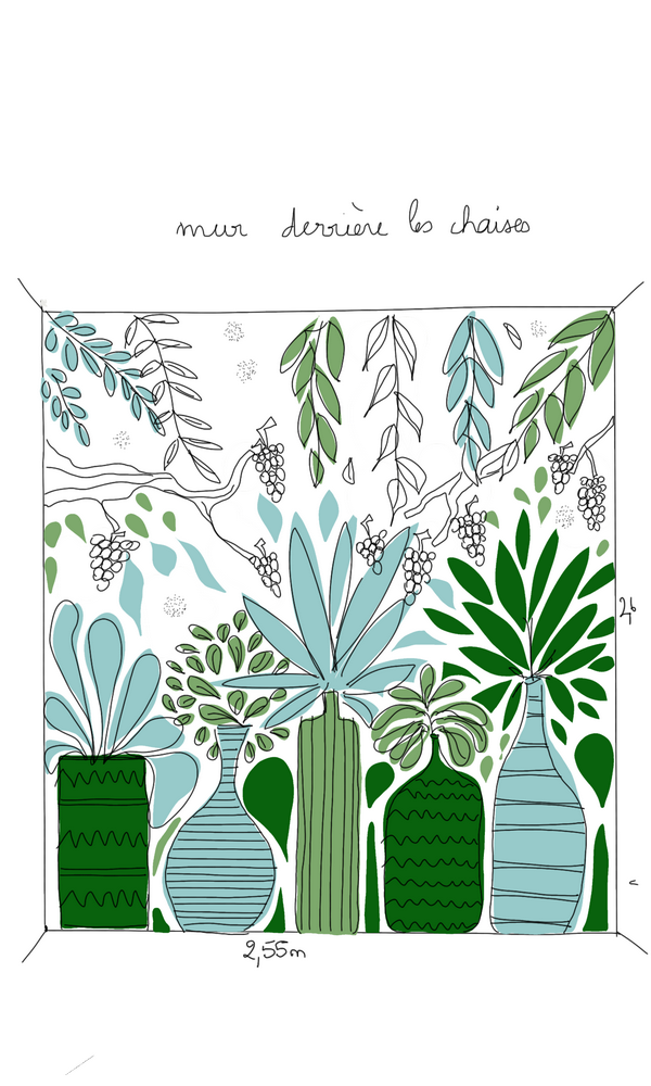 Un croquis d’abord pour se mettre d’accords … et tadam! Une fresque pour une déco personnalisée et unique qui vient se fondre dans le décors de ce magnifique salon déjà très coloré