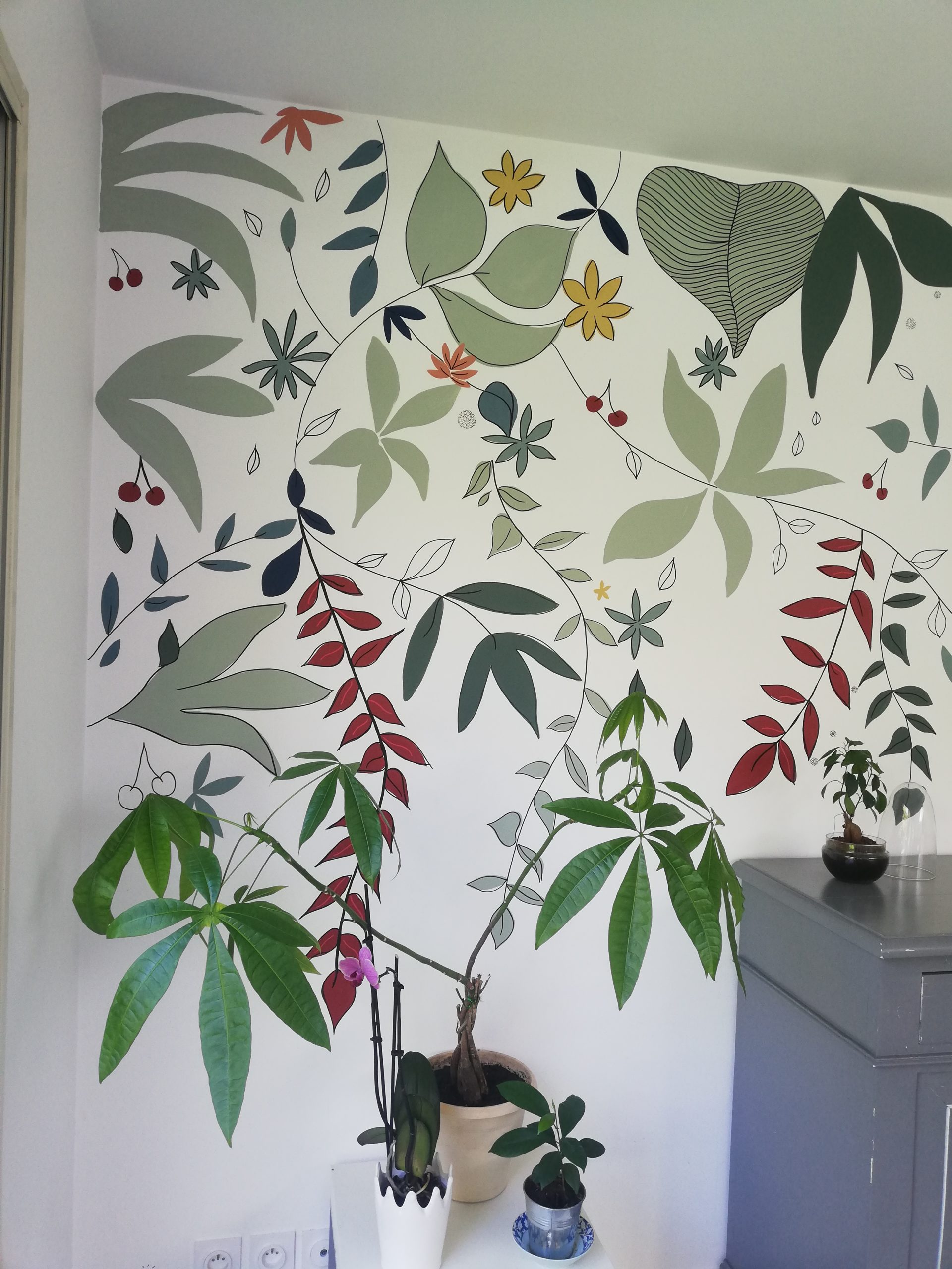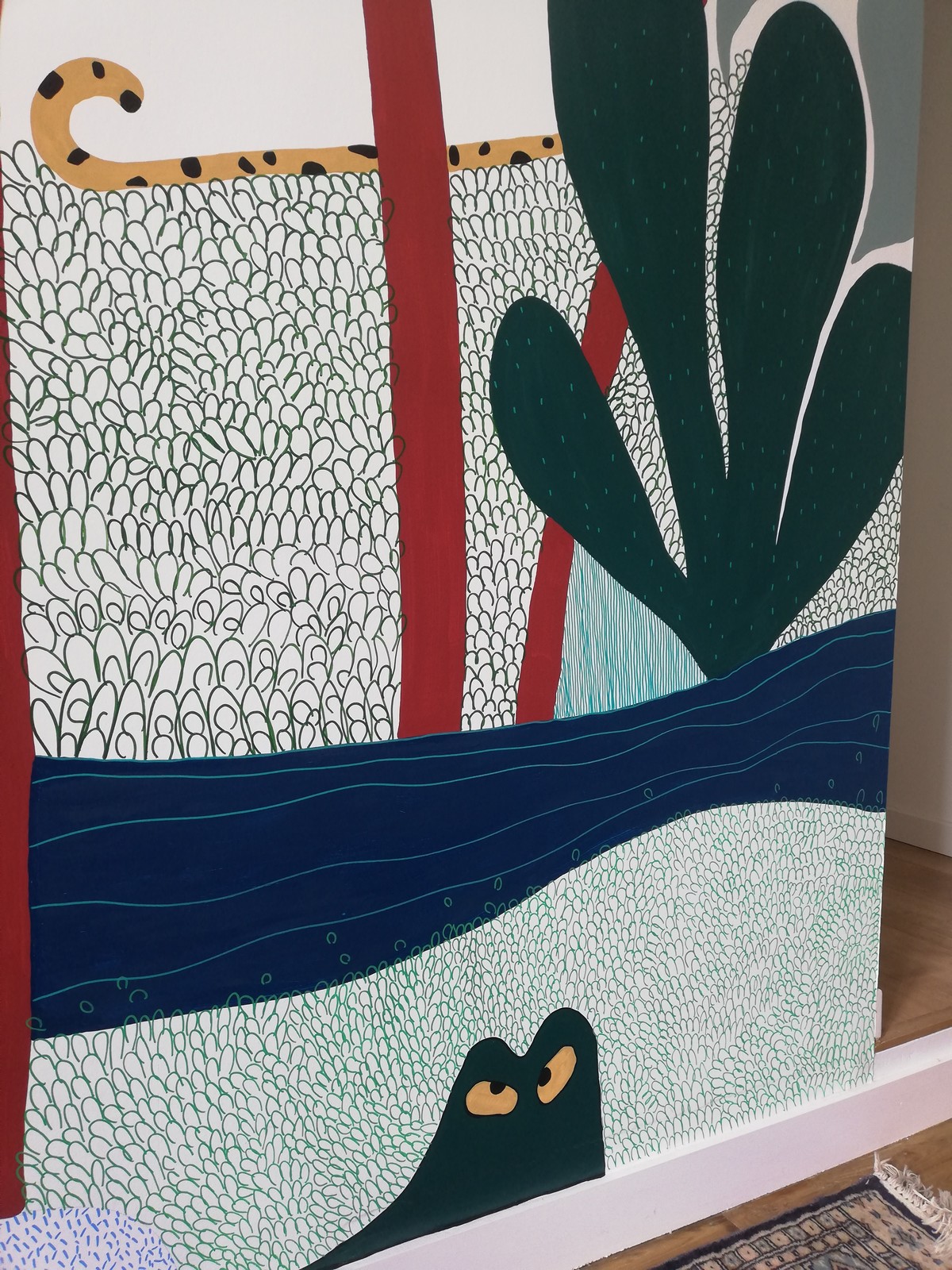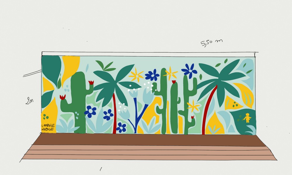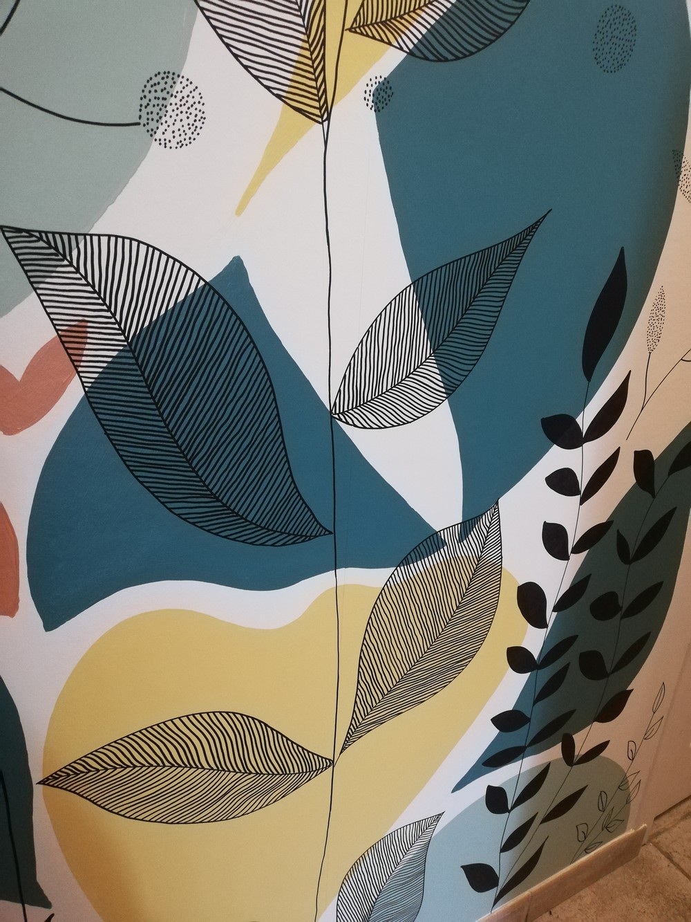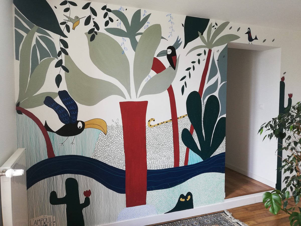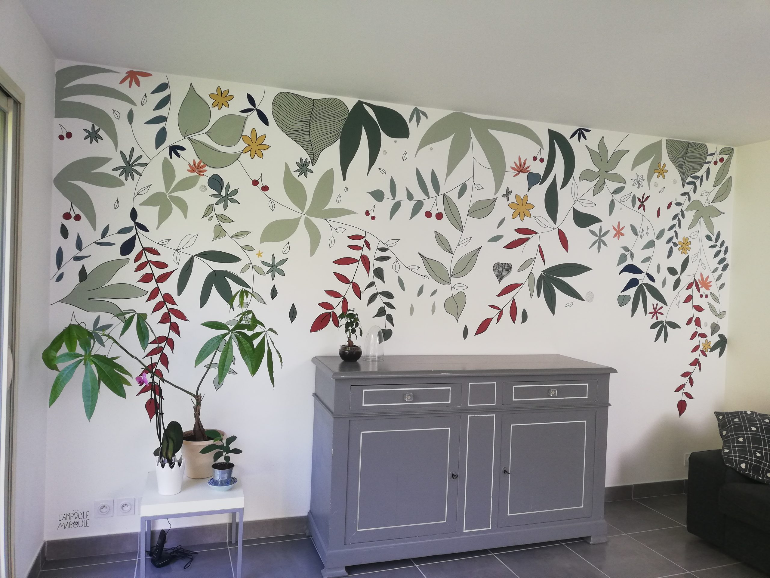 Un croquis d’abord pour se mettre d’accords … et tadam! Une fresque pour une déco personnalisée et unique qui vient se fondre dans le décors de ce magnifique salon déjà très coloré
