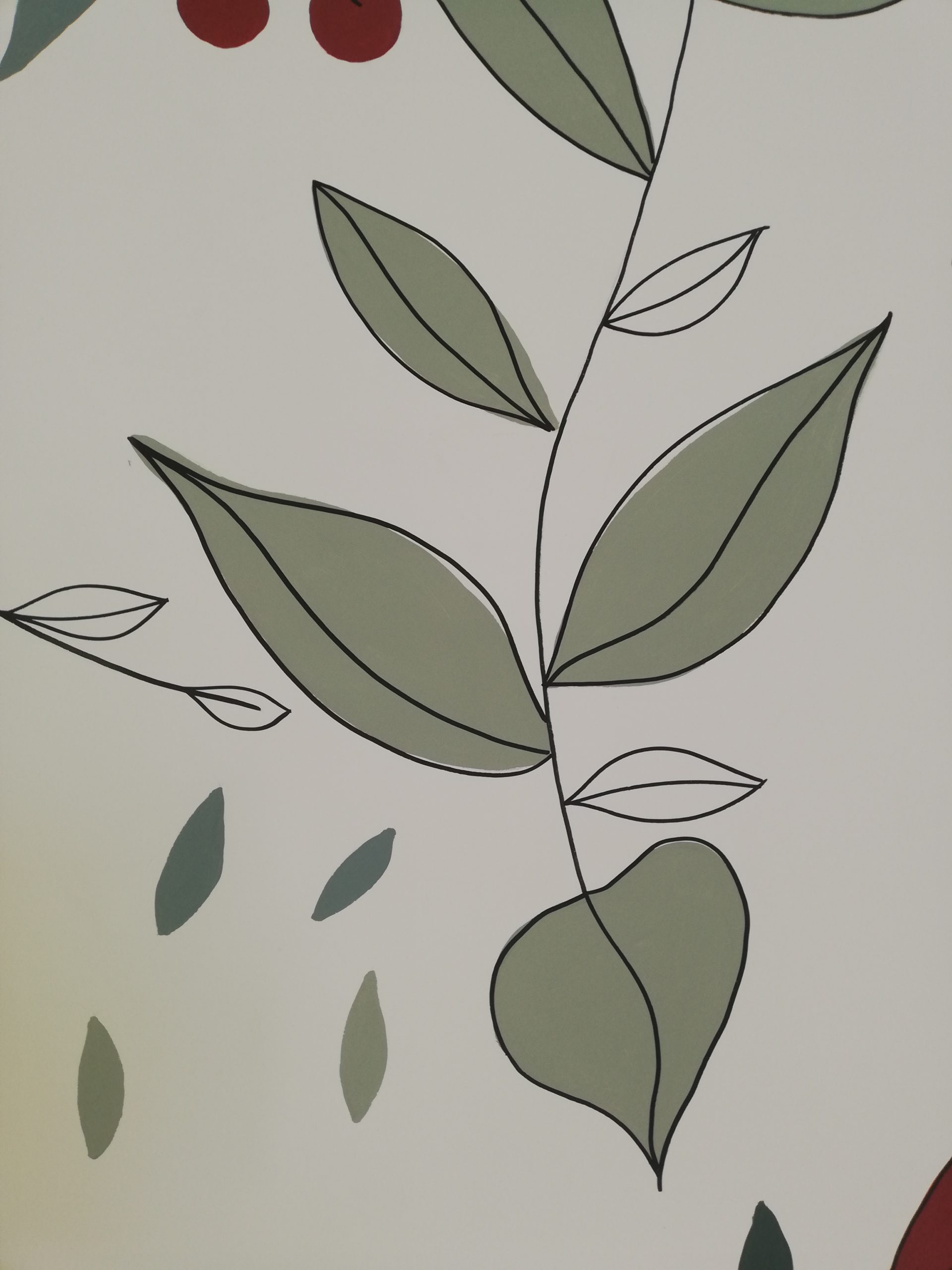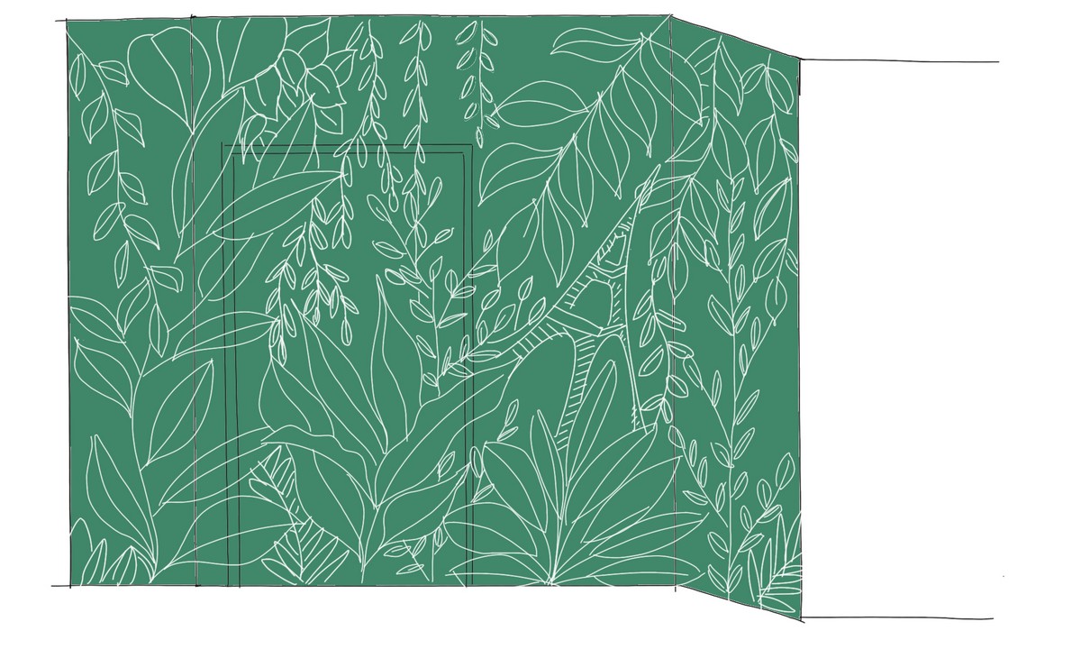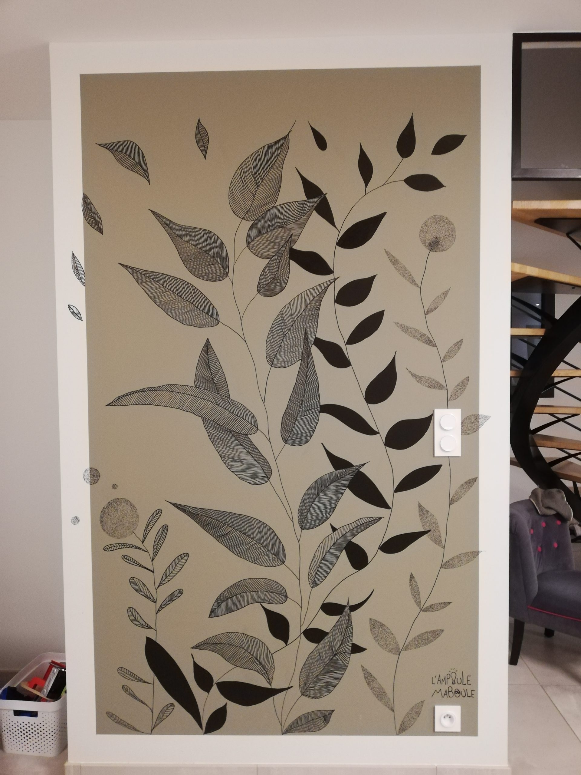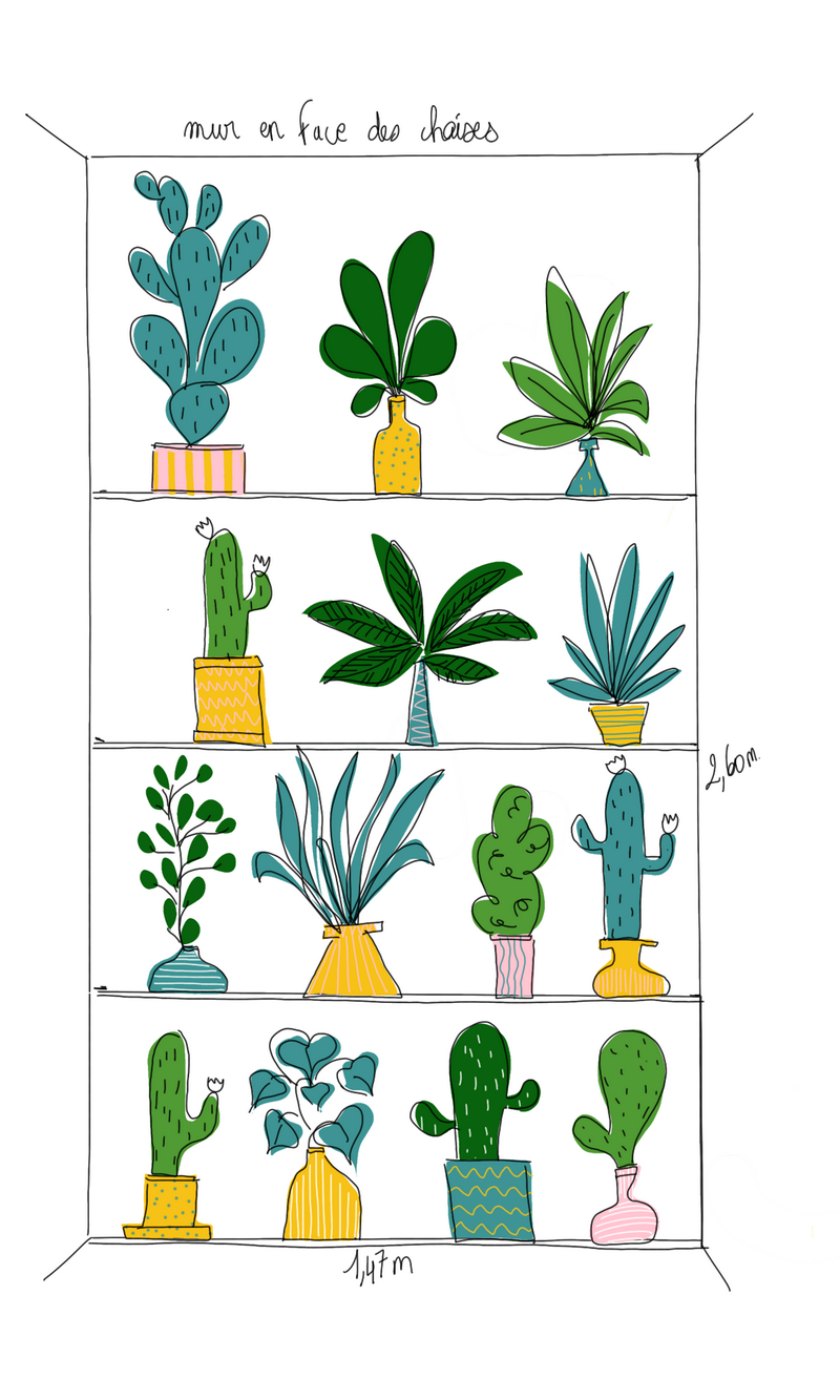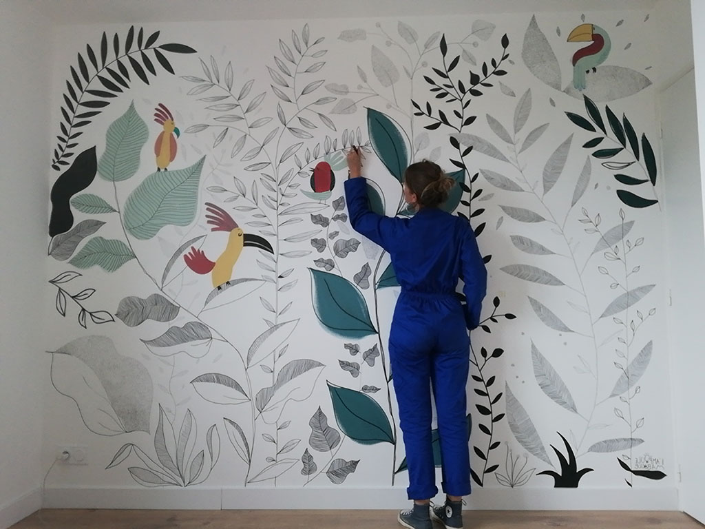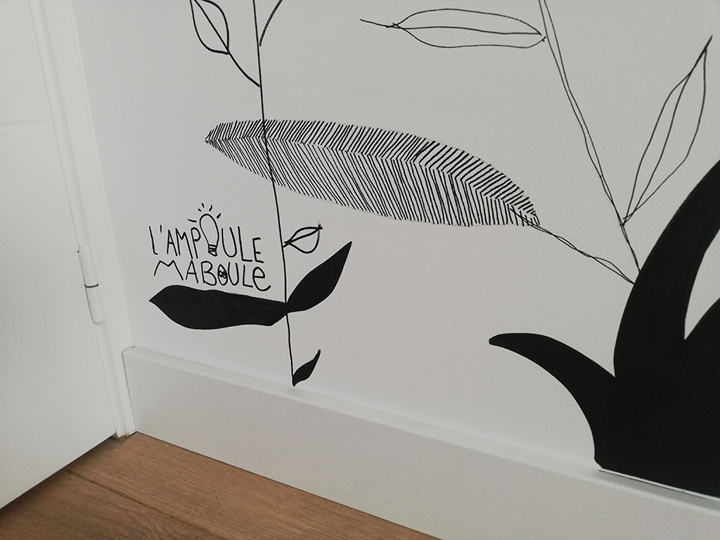 Un croquis d’abord pour se mettre d’accords … et tadam! Une fresque pour une déco personnalisée et unique qui vient se fondre dans le décors de ce magnifique salon déjà très coloré