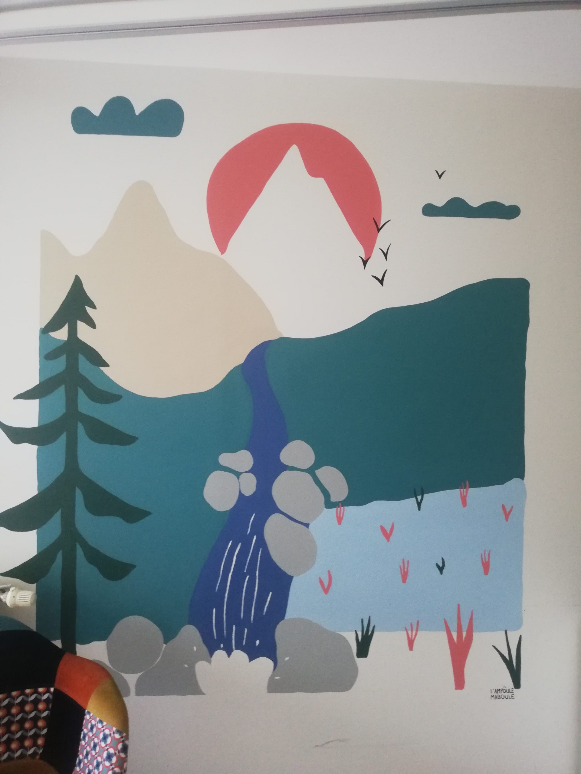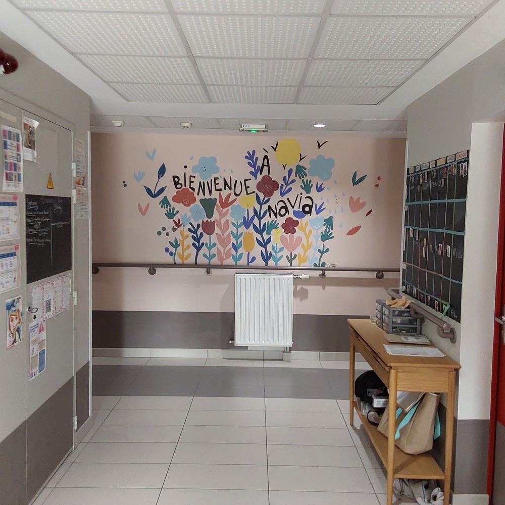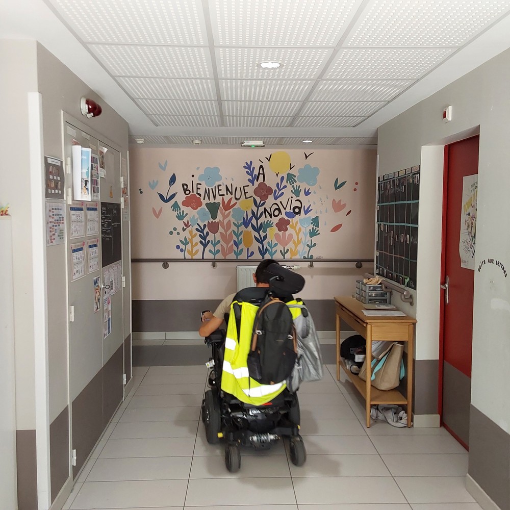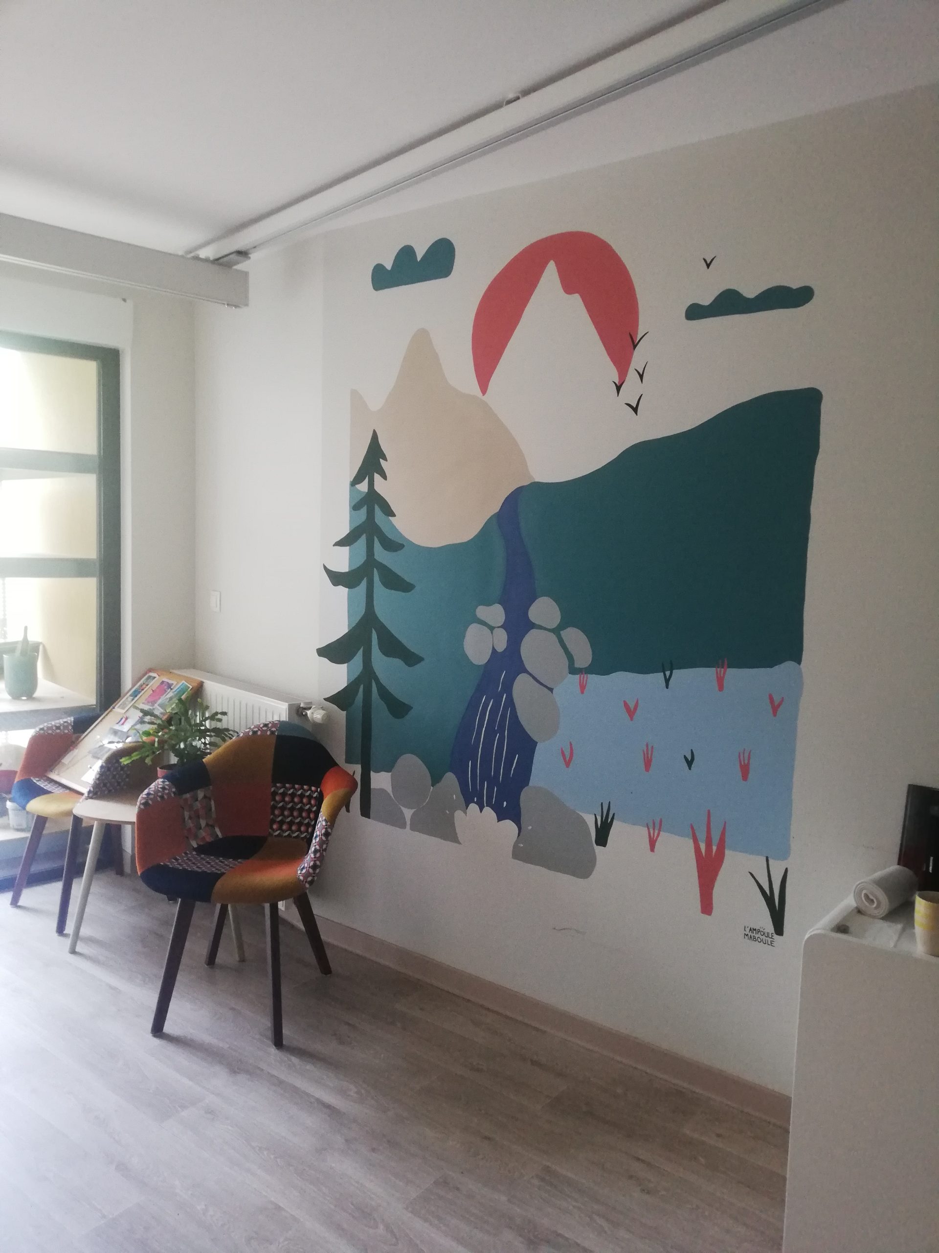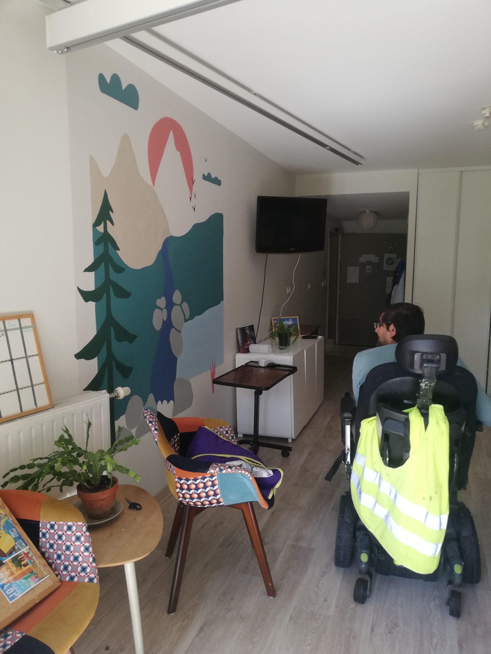 J’ai été très émue de réaliser ce projet au sein de cette maison partagée pour personnes en situation de handicap. Quel accueil j’ai reçu! Une fresque dans le hall d’entrée, imaginée par les résidents, pour souhaiter la bienvenue. Et une fresque dans la chambre d’un des résidents, qui souhaitait voir les montagnes et cascades de son pays natal, l’Afghanistan.