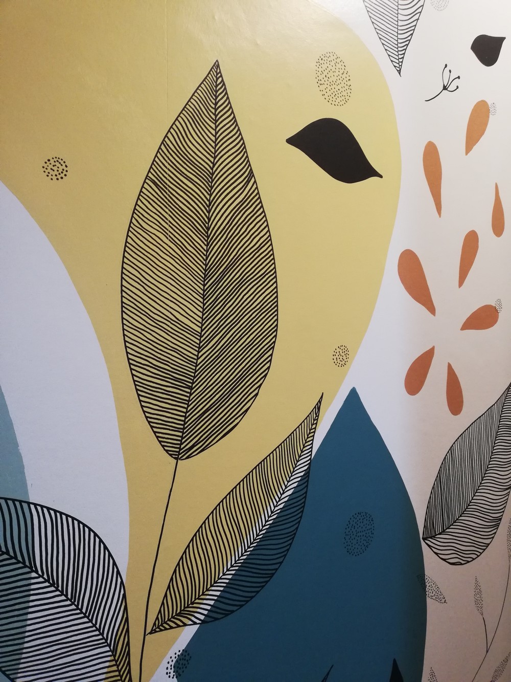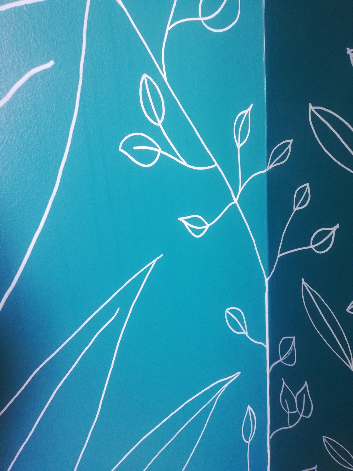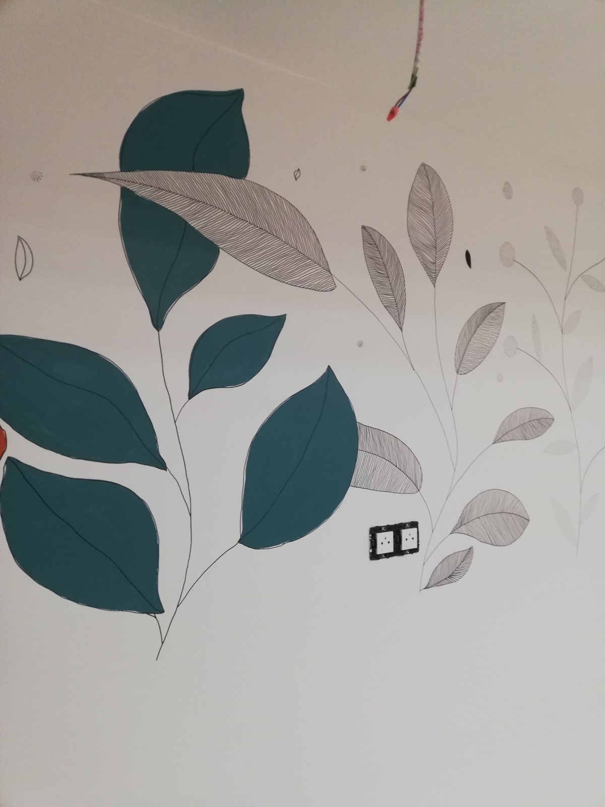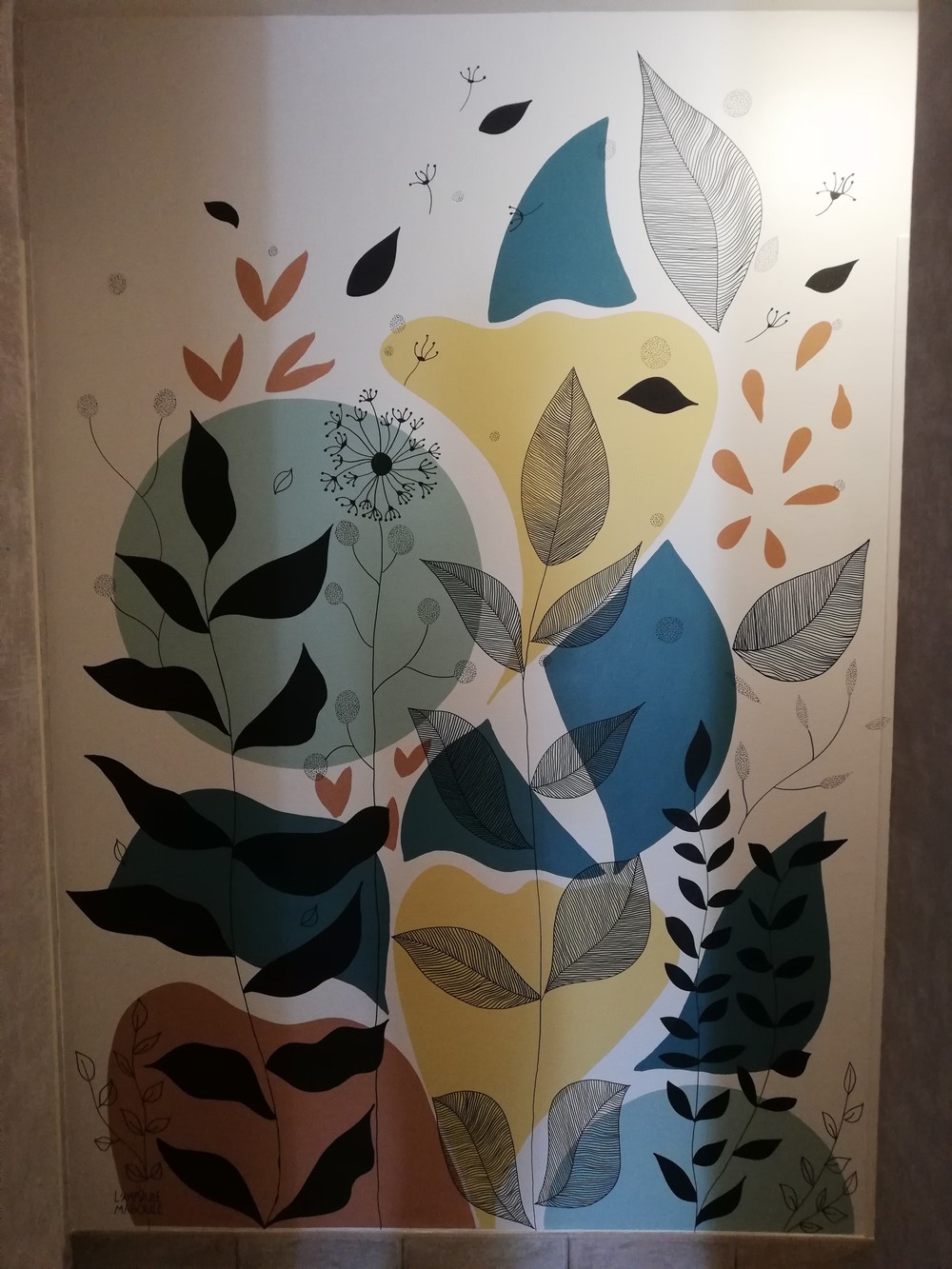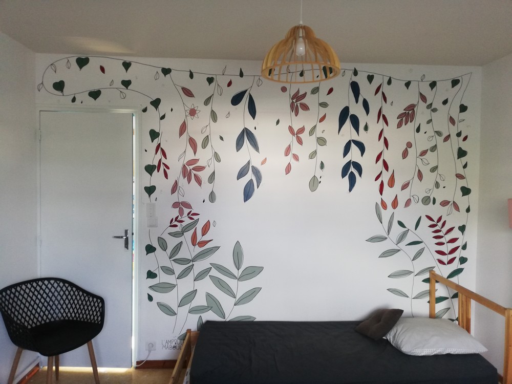 J’ai été très émue de réaliser ce projet au sein de cette maison partagée pour personnes en situation de handicap. Quel accueil j’ai reçu! Une fresque dans le hall d’entrée, imaginée par les résidents, pour souhaiter la bienvenue. Et une fresque dans la chambre d’un des résidents, qui souhaitait voir les montagnes et cascades de son pays natal, l’Afghanistan.