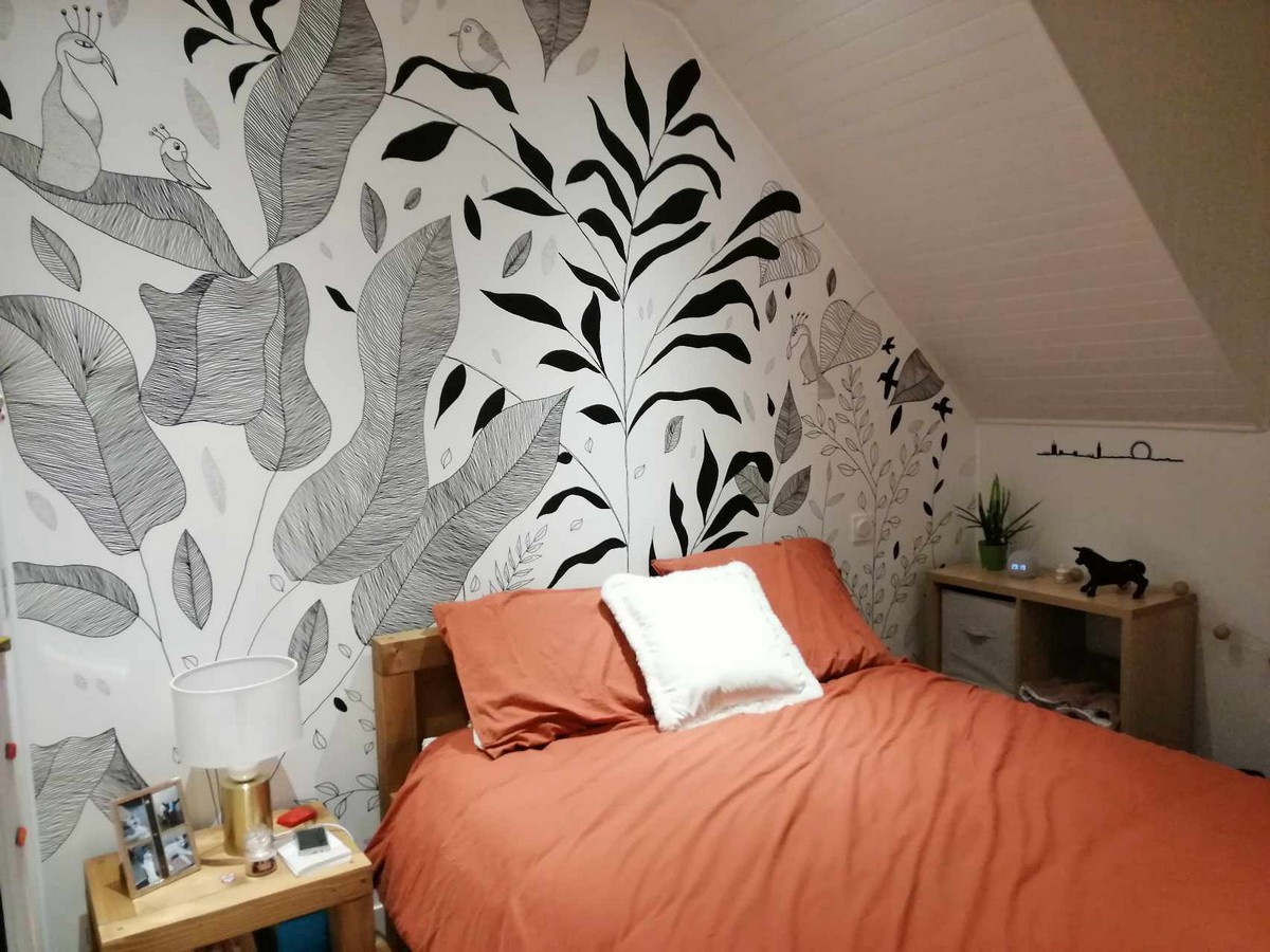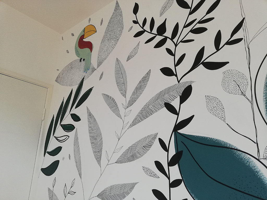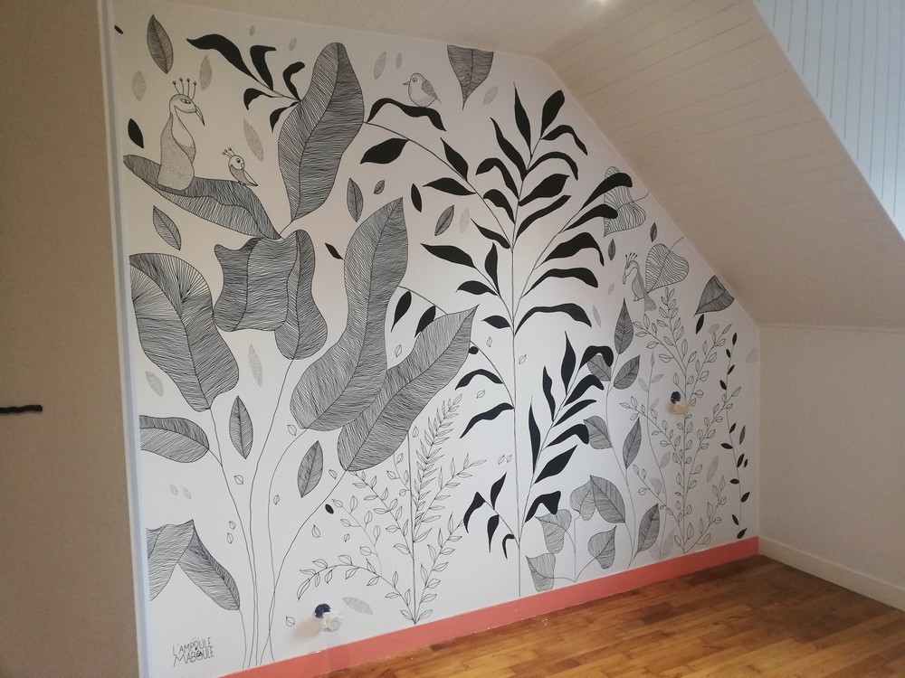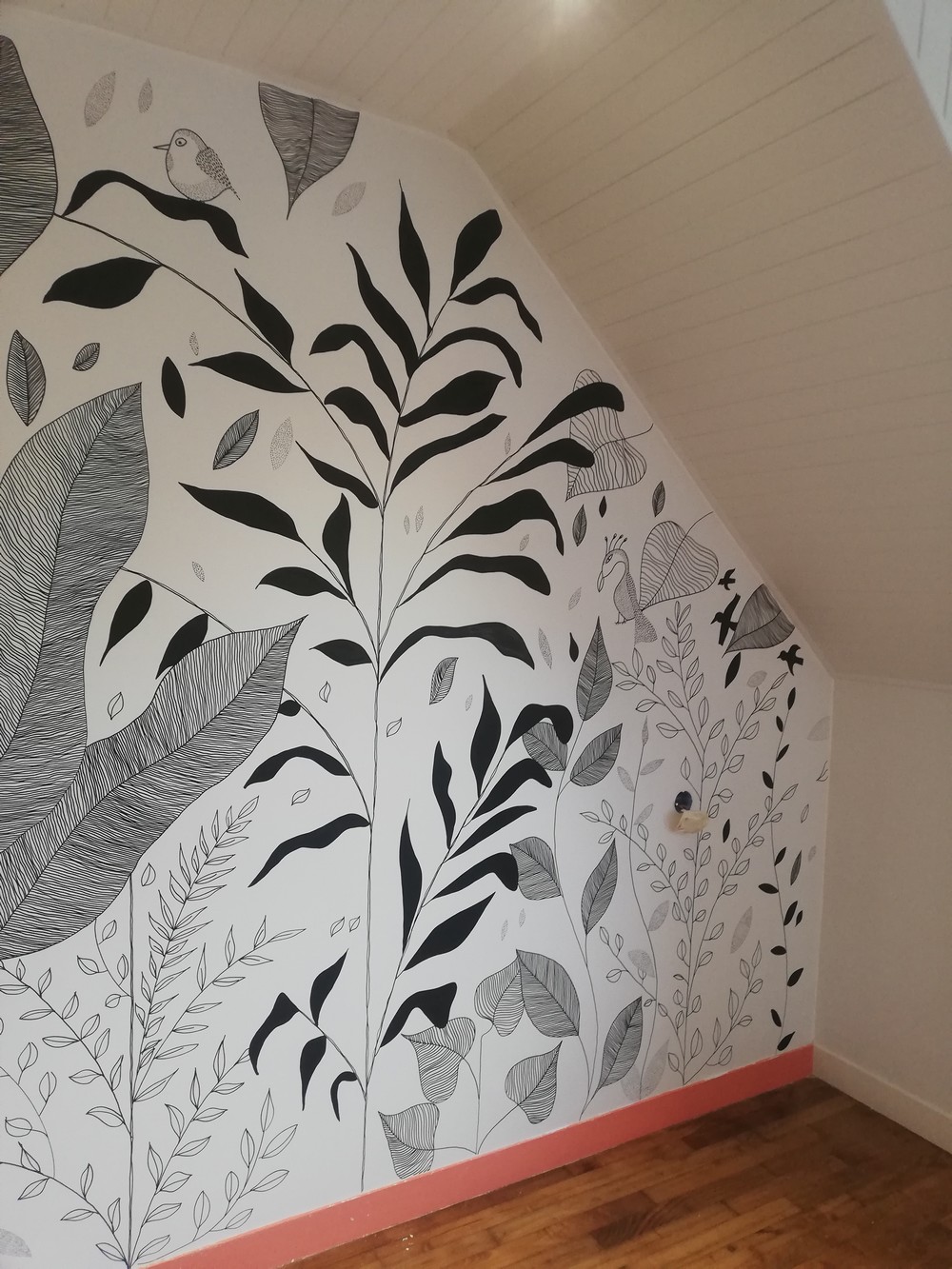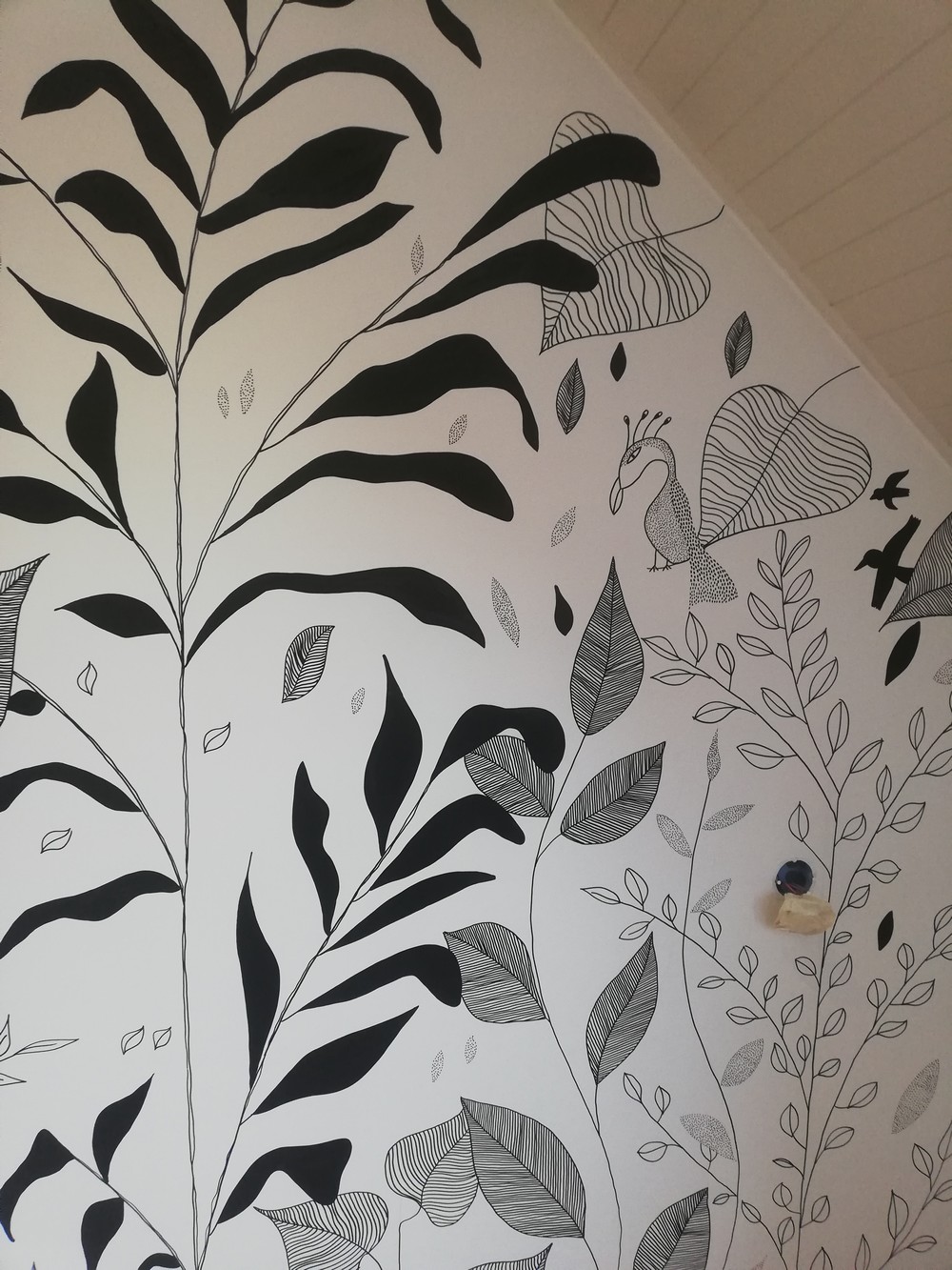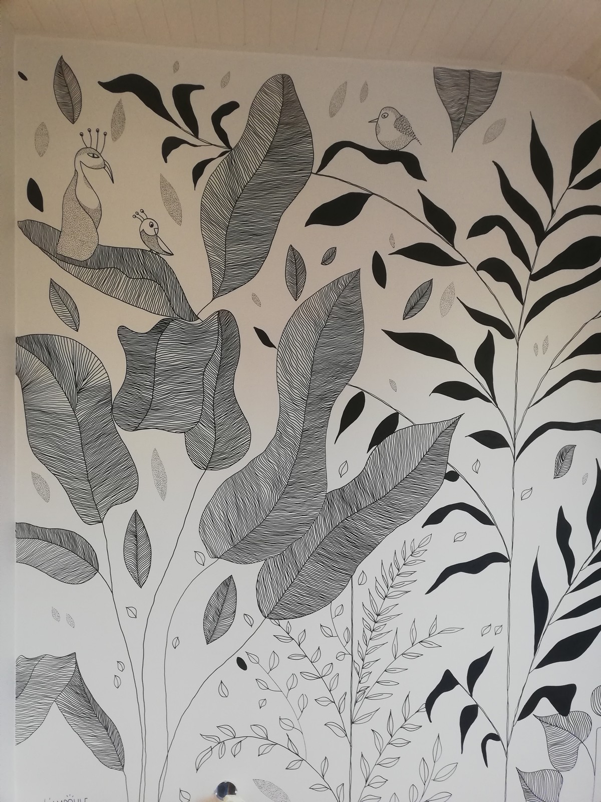 La pétillante petite Louise sait ce qu’elle veut pour sa chambre. Du feuillage noir sur fond blanc et quelques oiseaux un peu cachés. Elle veut se croire dans la jungle. Une fois son grand lit installé, avec une couette au coloris qui contraste avec le noir et blanc de la fresque, Louise est ravie!