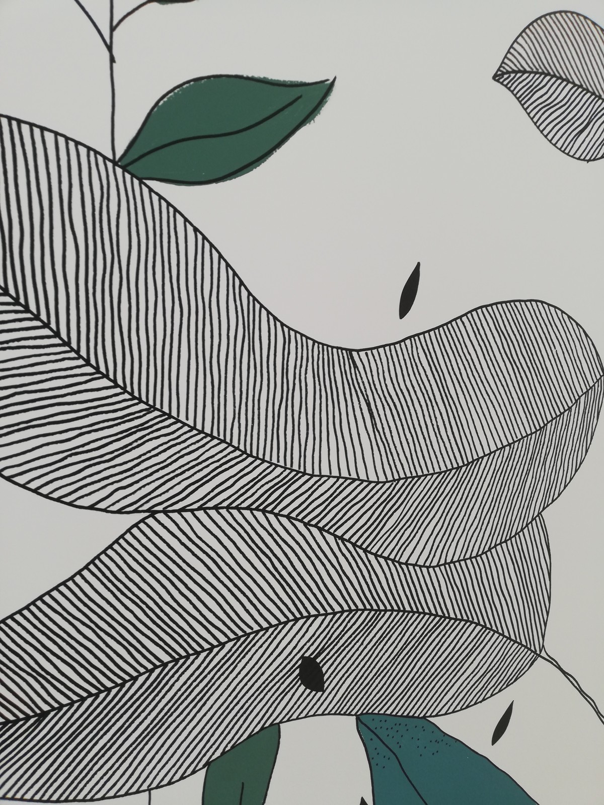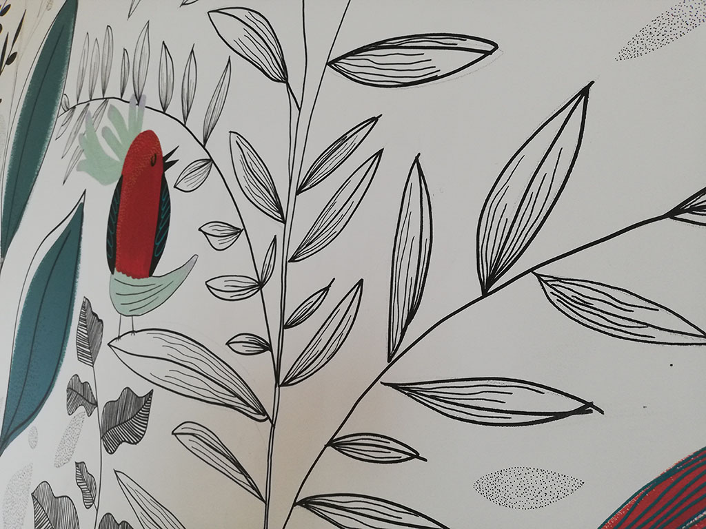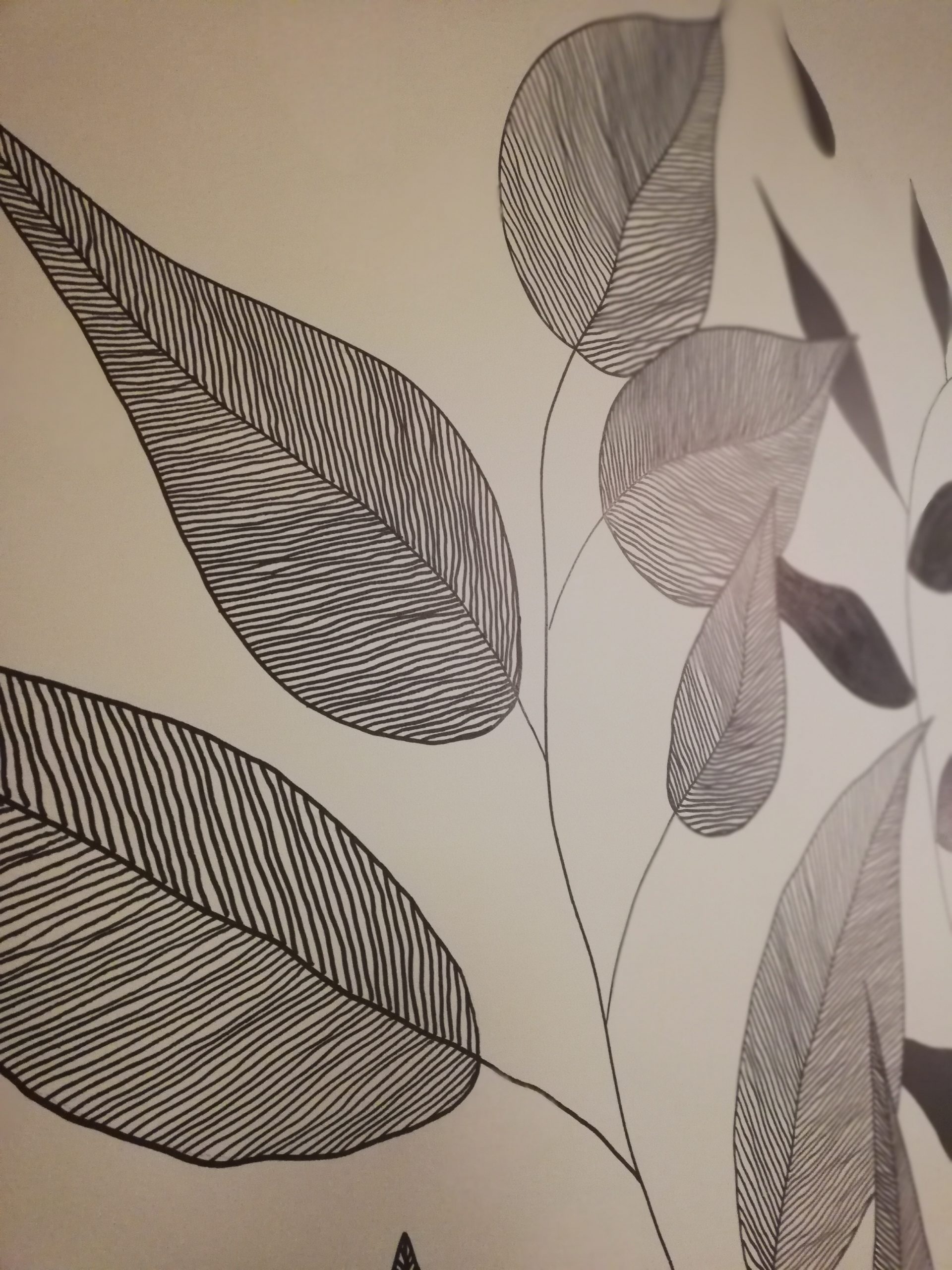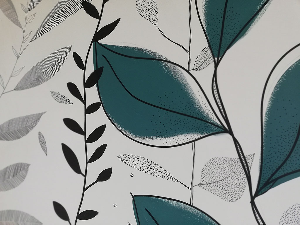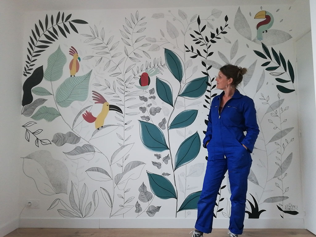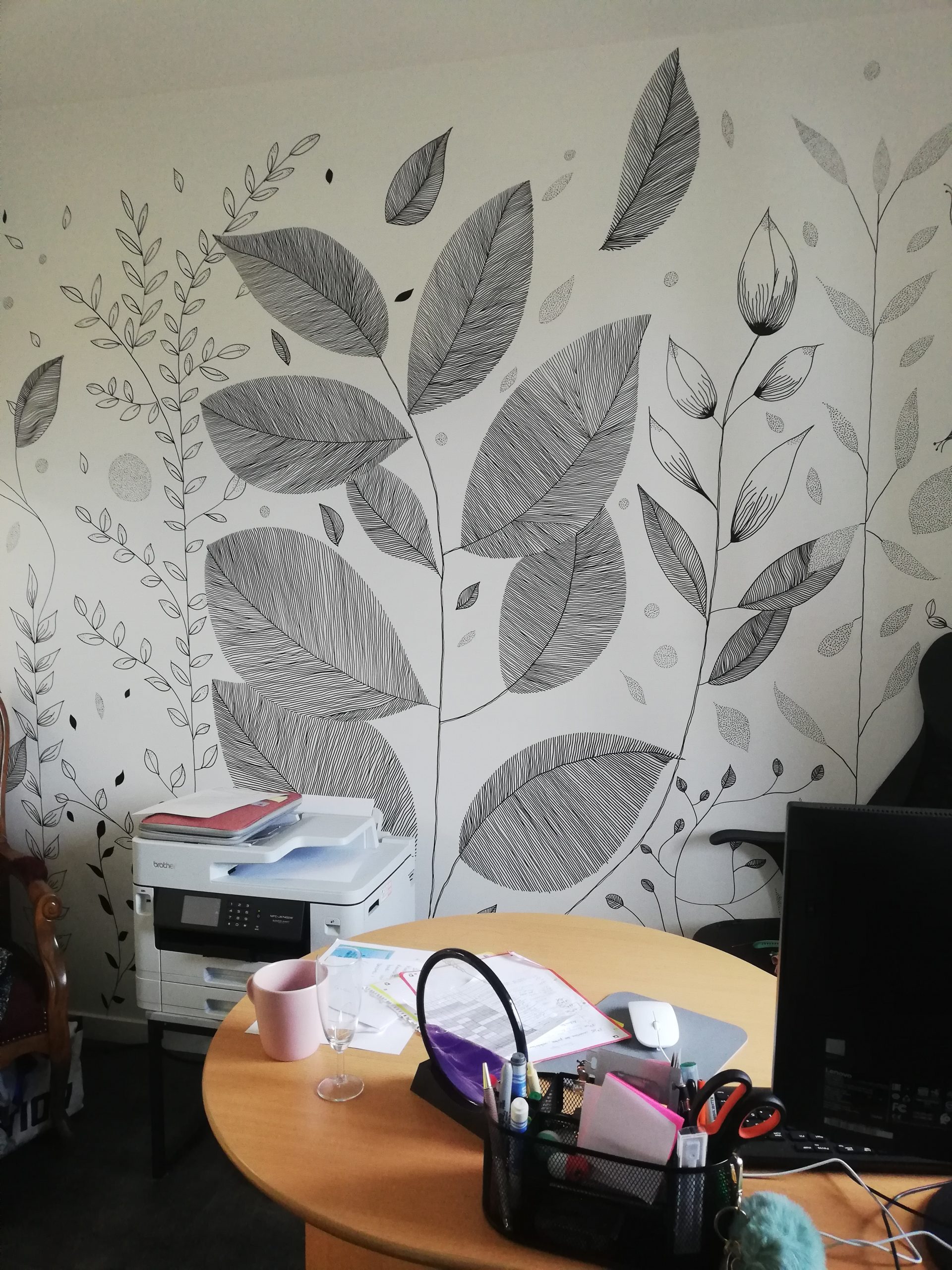 La pétillante petite Louise sait ce qu’elle veut pour sa chambre. Du feuillage noir sur fond blanc et quelques oiseaux un peu cachés. Elle veut se croire dans la jungle. Une fois son grand lit installé, avec une couette au coloris qui contraste avec le noir et blanc de la fresque, Louise est ravie!