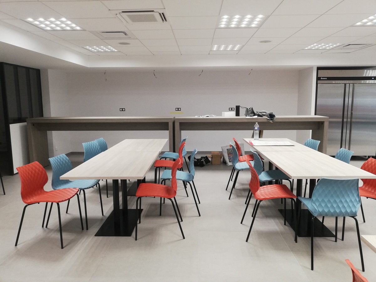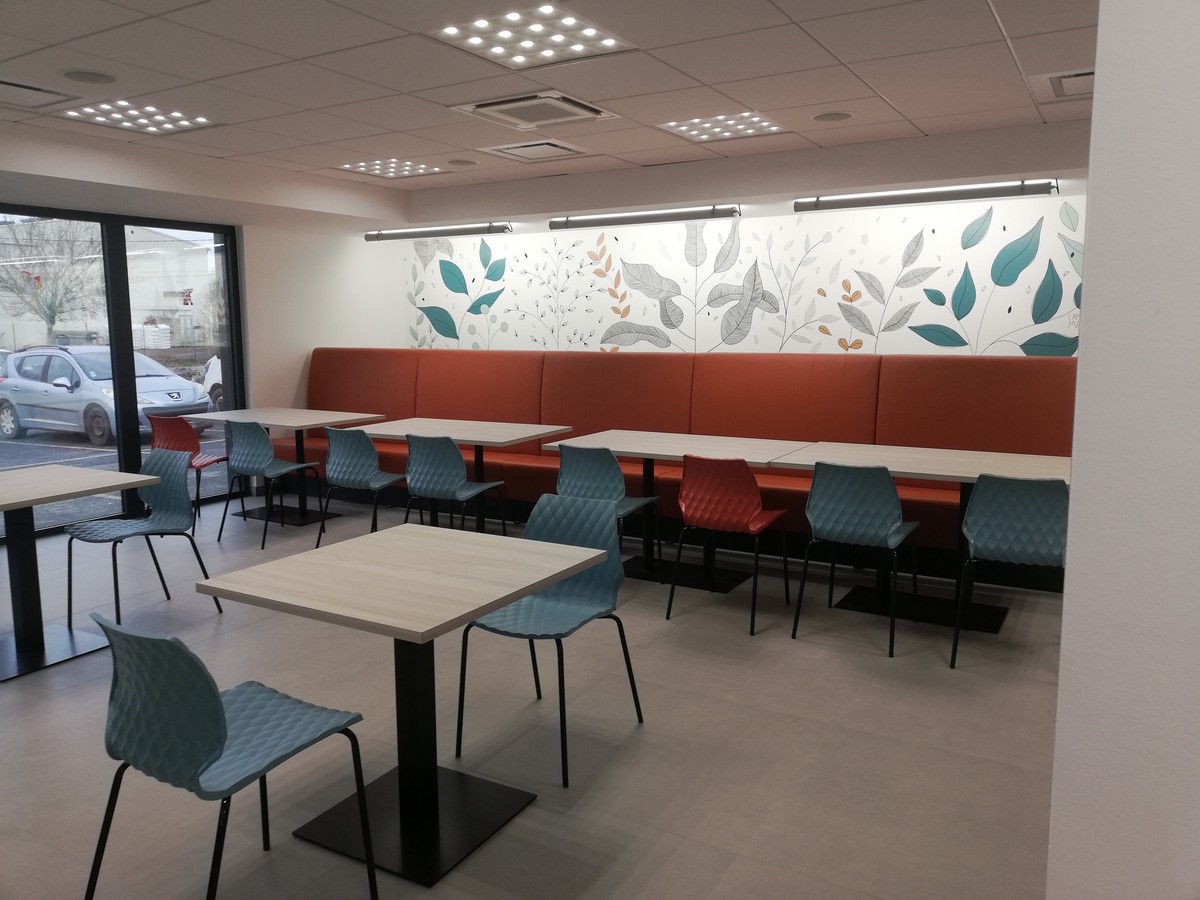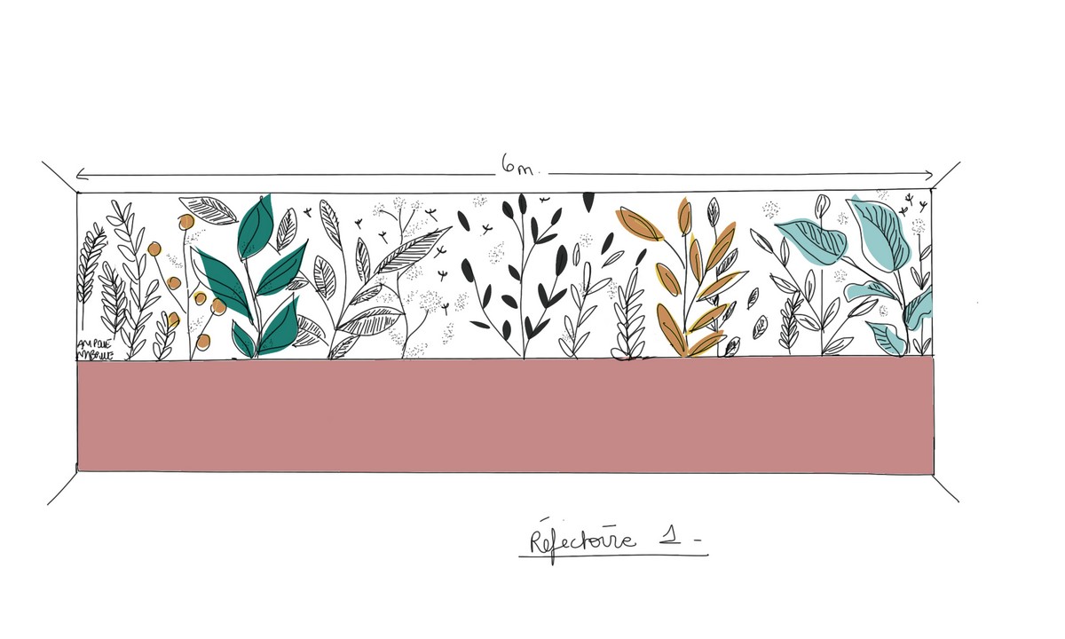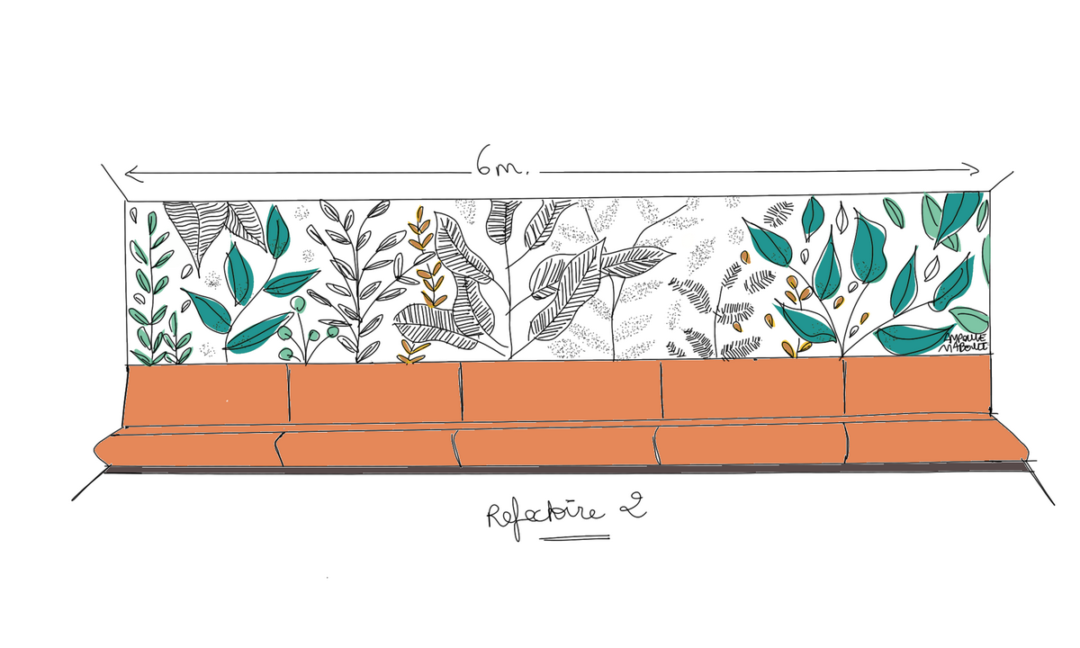 « Il faut que ce hall/réfectoire soit un endroit agréable et cosy pour les salariés ». Voici la commande pour personnaliser cette jolie salle, vaste, agréable, mais un peu trop blanche au goût des dirigeants de cette entreprise d’une centaine de salariés. Je m’adapte à la couleur des chaises pour proposer des croquis en adéquation avec la commande. Du vert foncé, du vert plus clair, du terracotta et des motifs végétaux pour apporter de la couleur et rendre encore plus chaleureux ce lieu de convivialité. Seront ajoutés des claustras et des plantes vertes pour finaliser le tout!