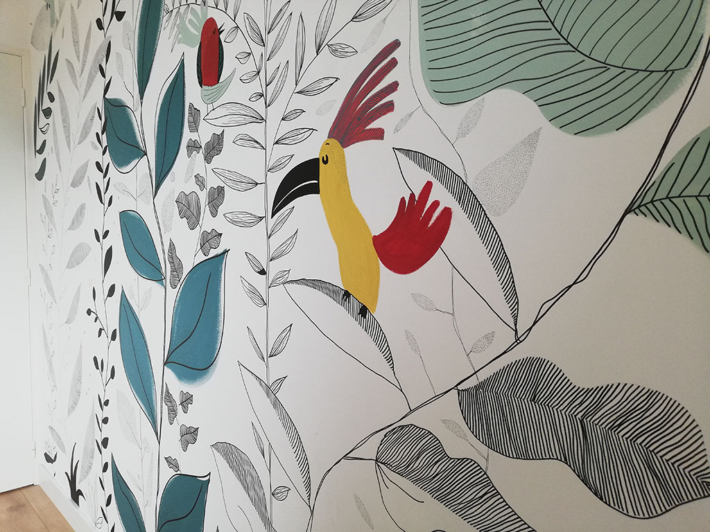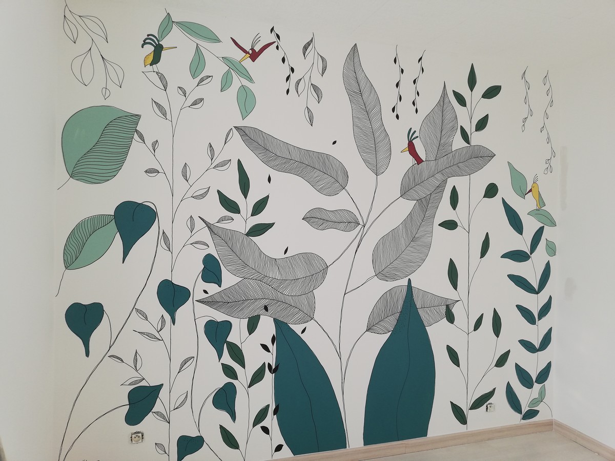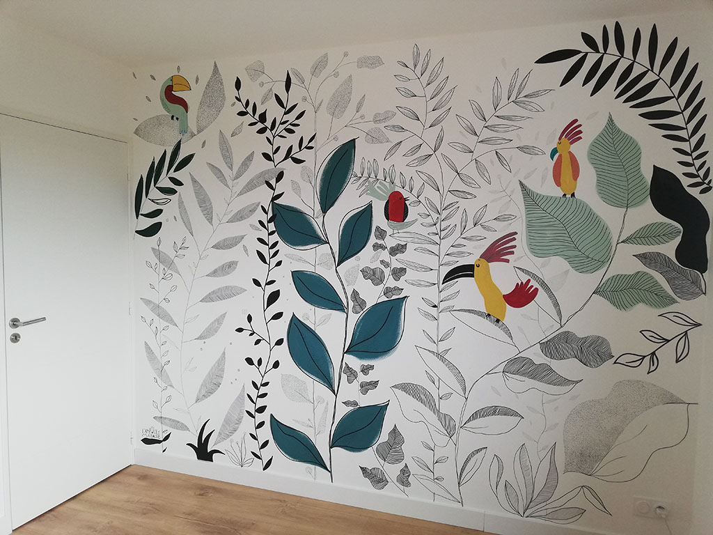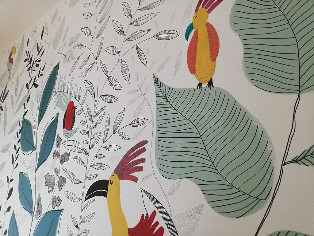 Quelques notes de couleurs , du joli feuillage, des oiseaux … et le tour est joué, Sacha a de nouveaux copains volatiles dans sa chambre à la décoration unique!