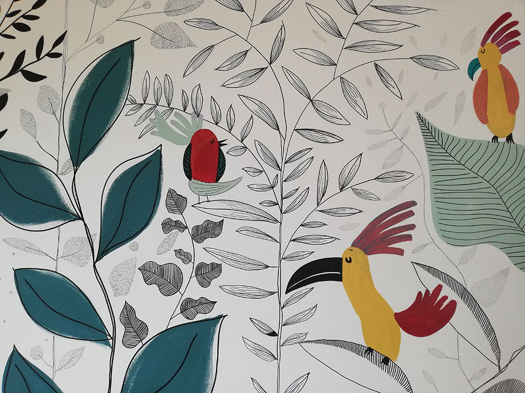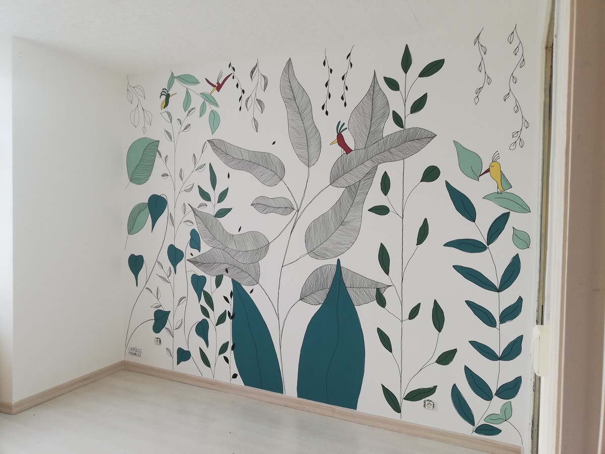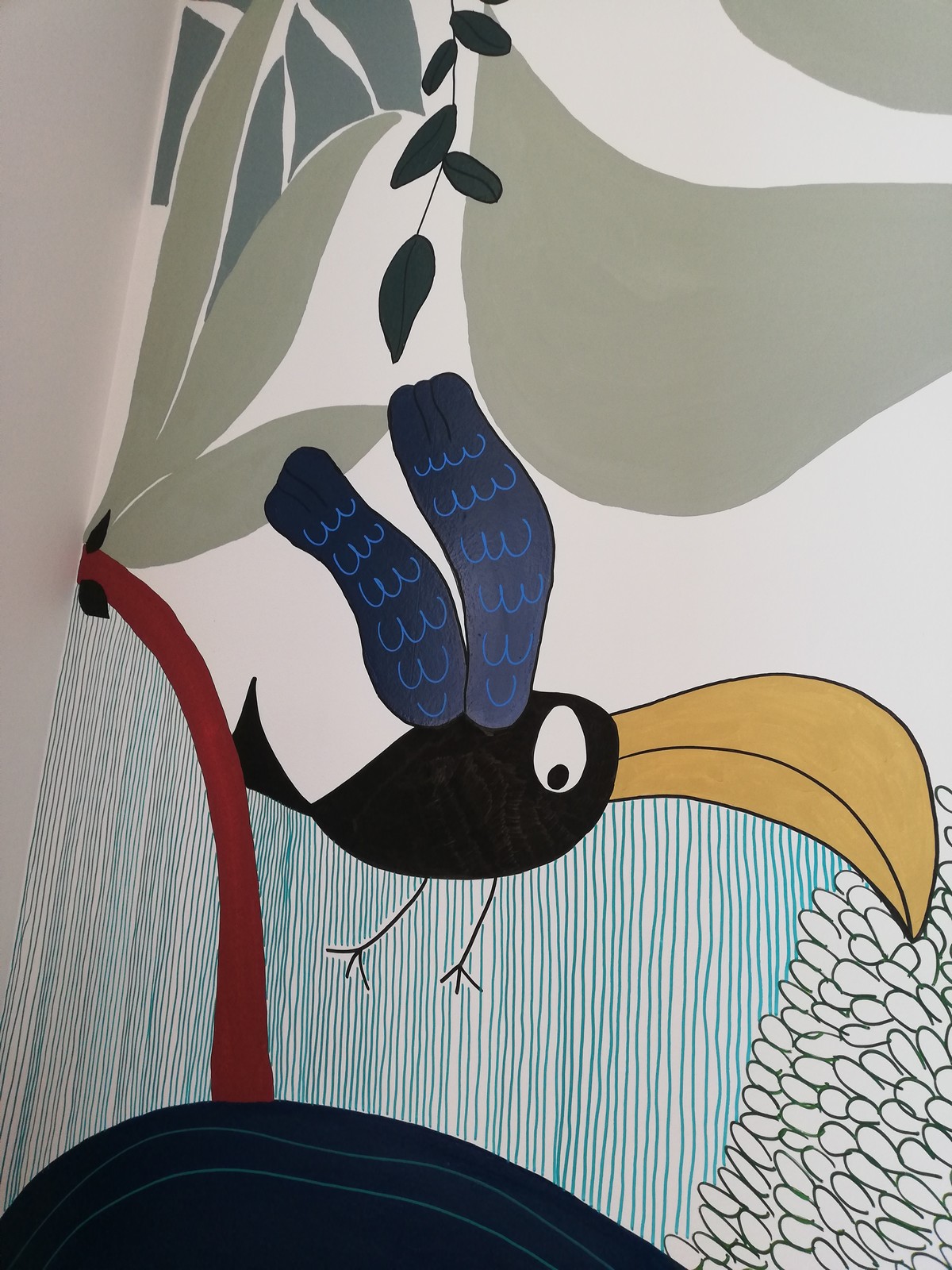 Quelques notes de couleurs , du joli feuillage, des oiseaux … et le tour est joué, Sacha a de nouveaux copains volatiles dans sa chambre à la décoration unique!