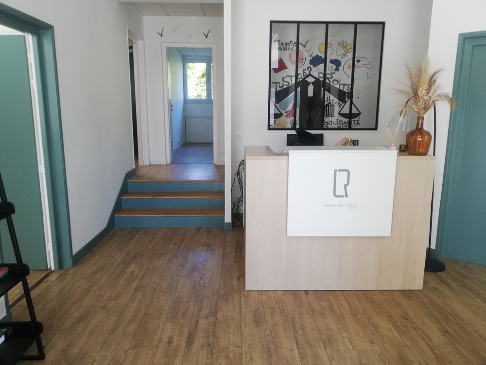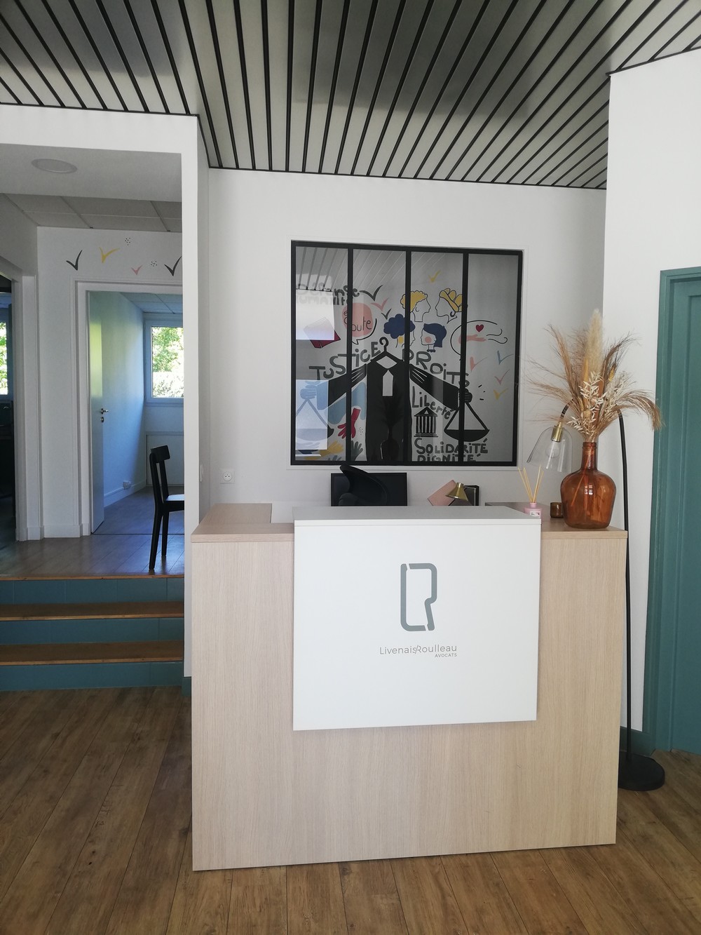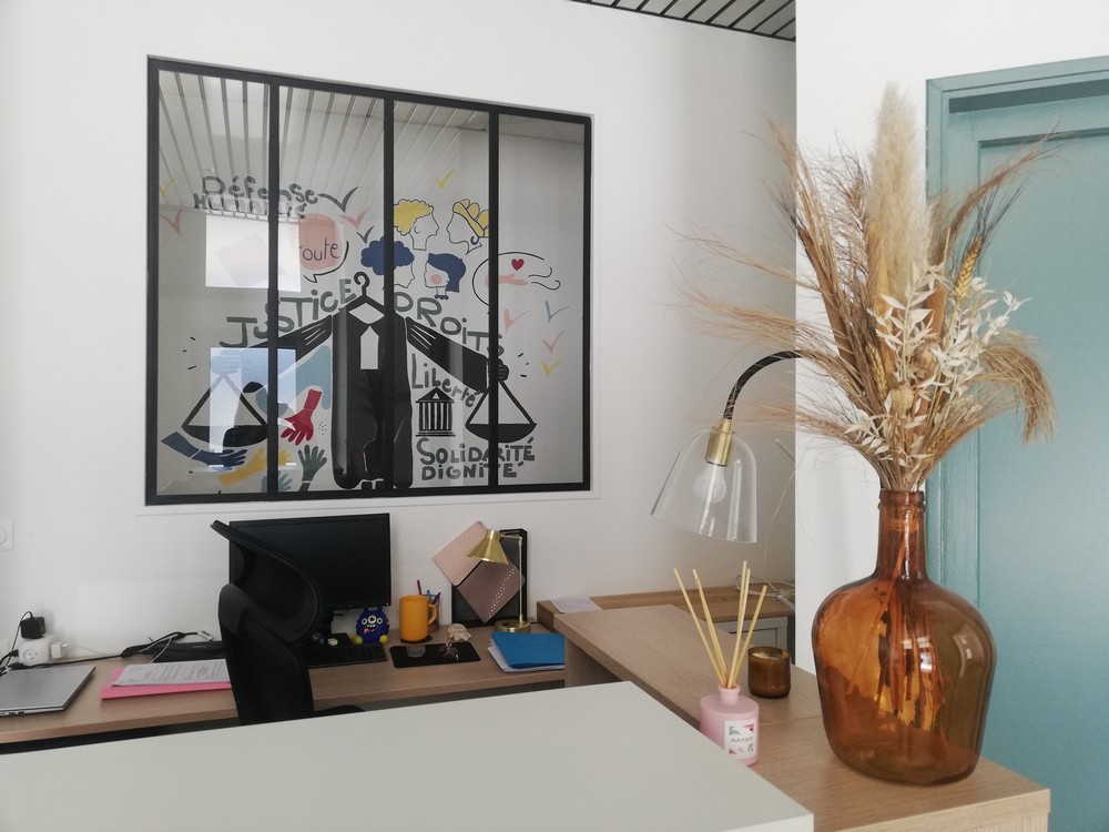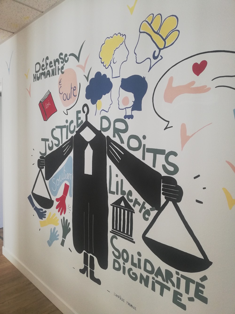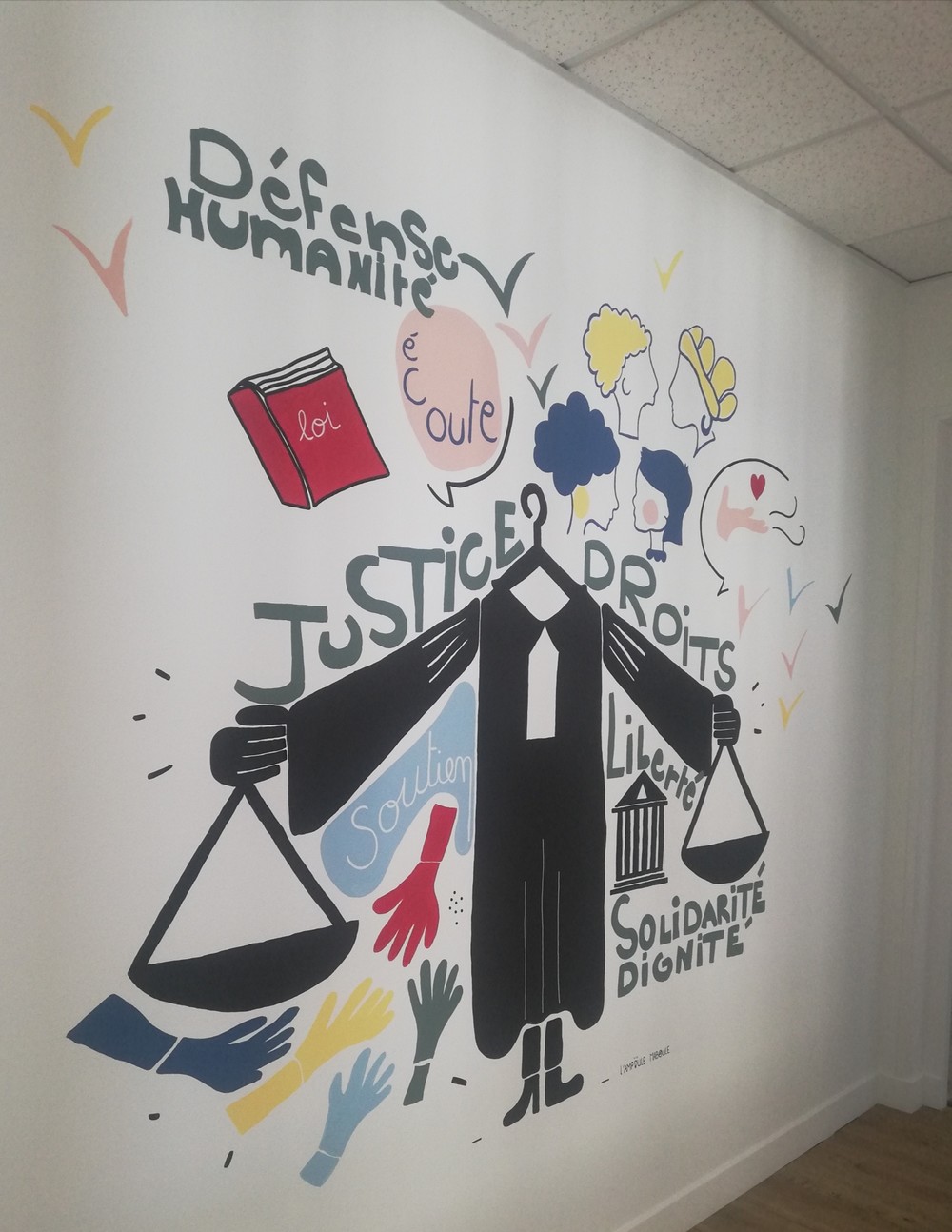 La commande de cette fresque était de représenter leur métier d’avocats , leurs valeurs. La robe évidement, une chaussure homme, une chaussure femme pour signifier la parité et le fait que ce sont des associés homme et femmes, la balance de la justice, le palais de justice, des visages de personnes accompagnées , des oiseaux pour « aider les personnes à voler de leurs propres ailes », un cœur et des mains tendues pour l’empathie, et des mots clés qui sont leurs valeurs fortes. Des couleurs douces et un visuel qui se voit dès l’entrée dans le cabinet, d’abord à travers la verrière puis dans son entièreté en avançant vers les bureaux.