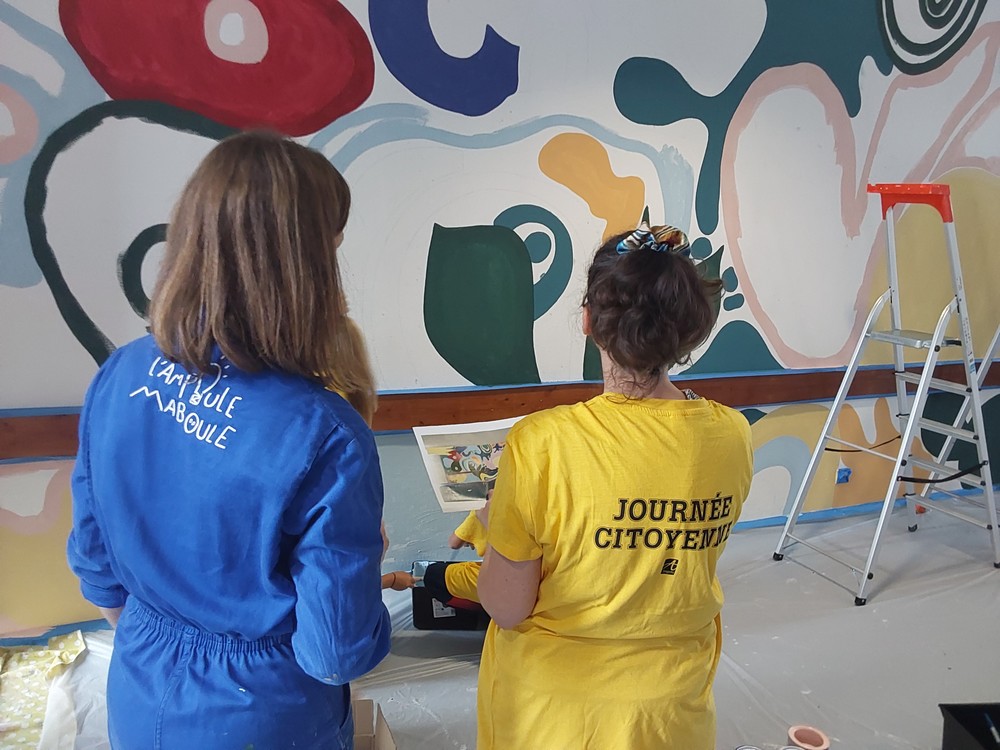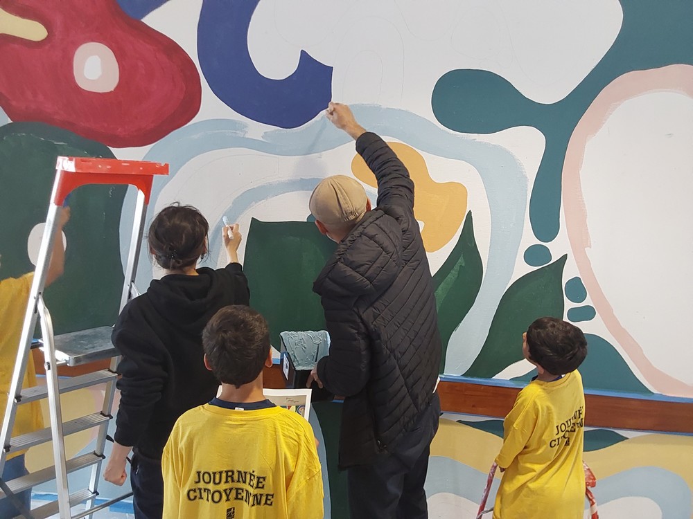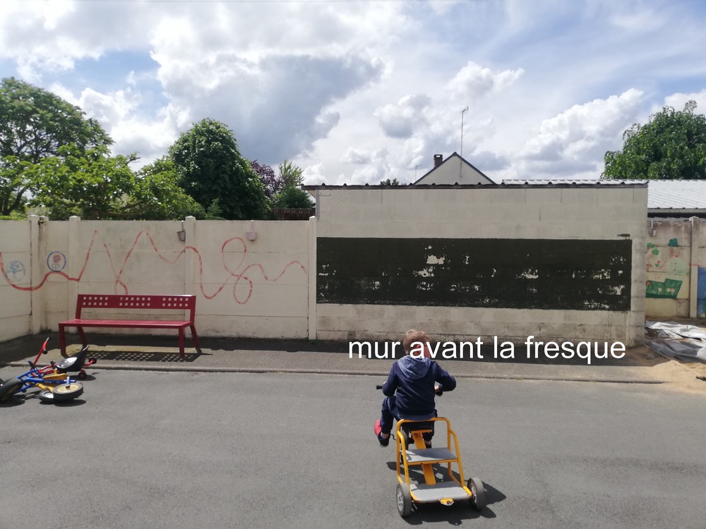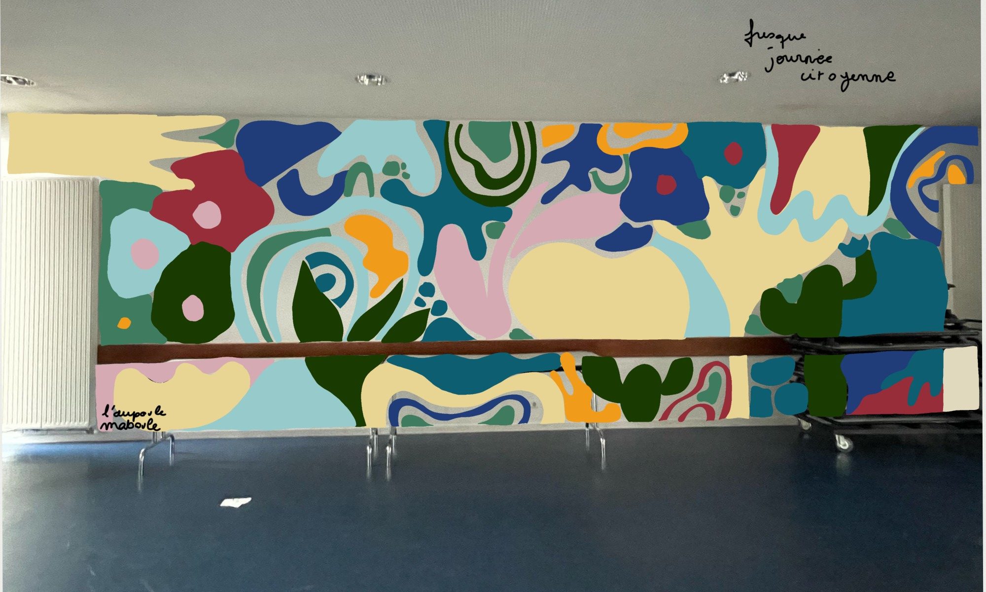 La mairie d’Angers m’a sollicitée pour réaliser, dans le cadre de sa journée citoyenne, une fresque participative avec les habitants. Ce fut une magnifique journée, où petits et grands ont travaillé ensemble dans la bonne humeur pour créer cette belle fresque de 10m de long dans une salle municipale. J’étais ravie de voir ces adultes retomber en enfance en peignant, tirant la langue, dans un calme (voire silence) presque méditatif, et les enfants se concentrer sur leur täche, tout en prenant du plaisir au point de revenir dans la journée pour faire le 2ème atelier. Expérience réussie, à renouveler!