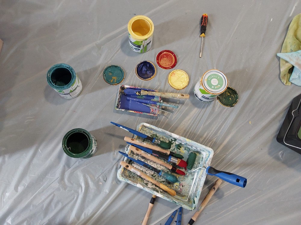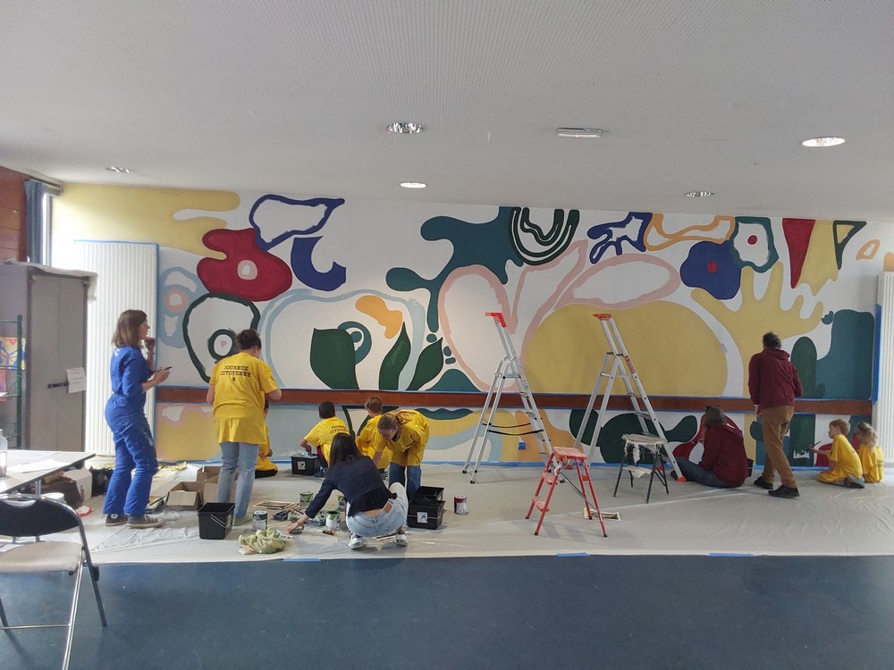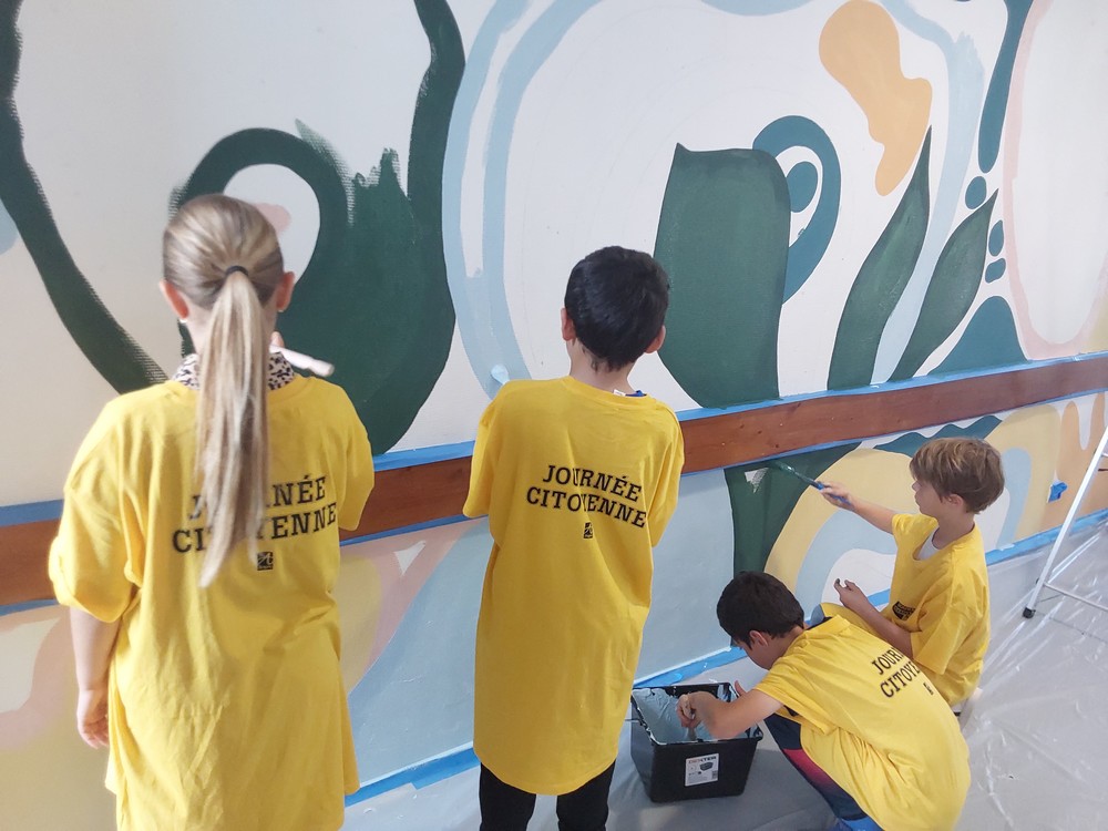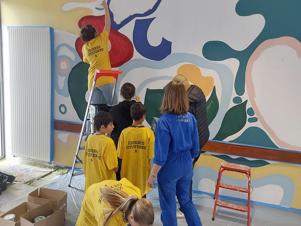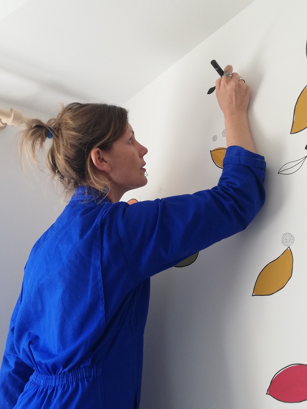 La mairie d’Angers m’a sollicitée pour réaliser, dans le cadre de sa journée citoyenne, une fresque participative avec les habitants. Ce fut une magnifique journée, où petits et grands ont travaillé ensemble dans la bonne humeur pour créer cette belle fresque de 10m de long dans une salle municipale. J’étais ravie de voir ces adultes retomber en enfance en peignant, tirant la langue, dans un calme (voire silence) presque méditatif, et les enfants se concentrer sur leur täche, tout en prenant du plaisir au point de revenir dans la journée pour faire le 2ème atelier. Expérience réussie, à renouveler!