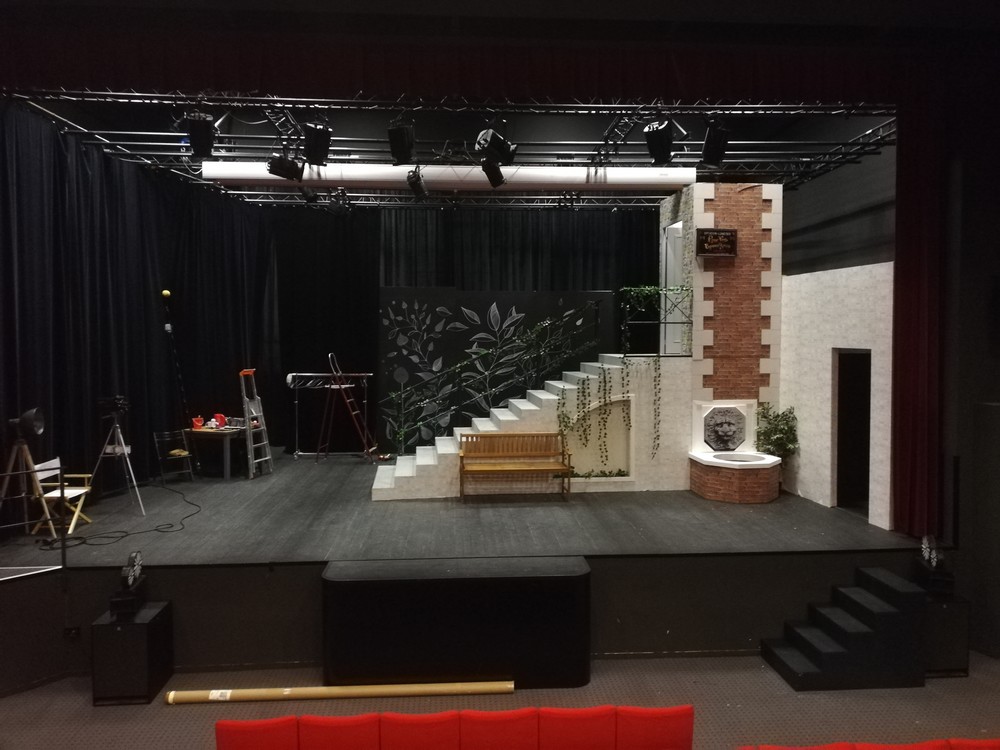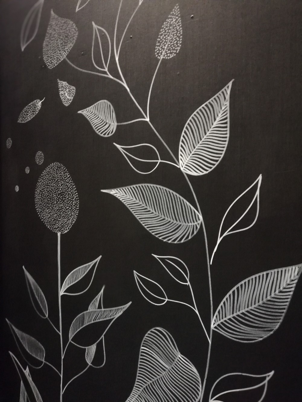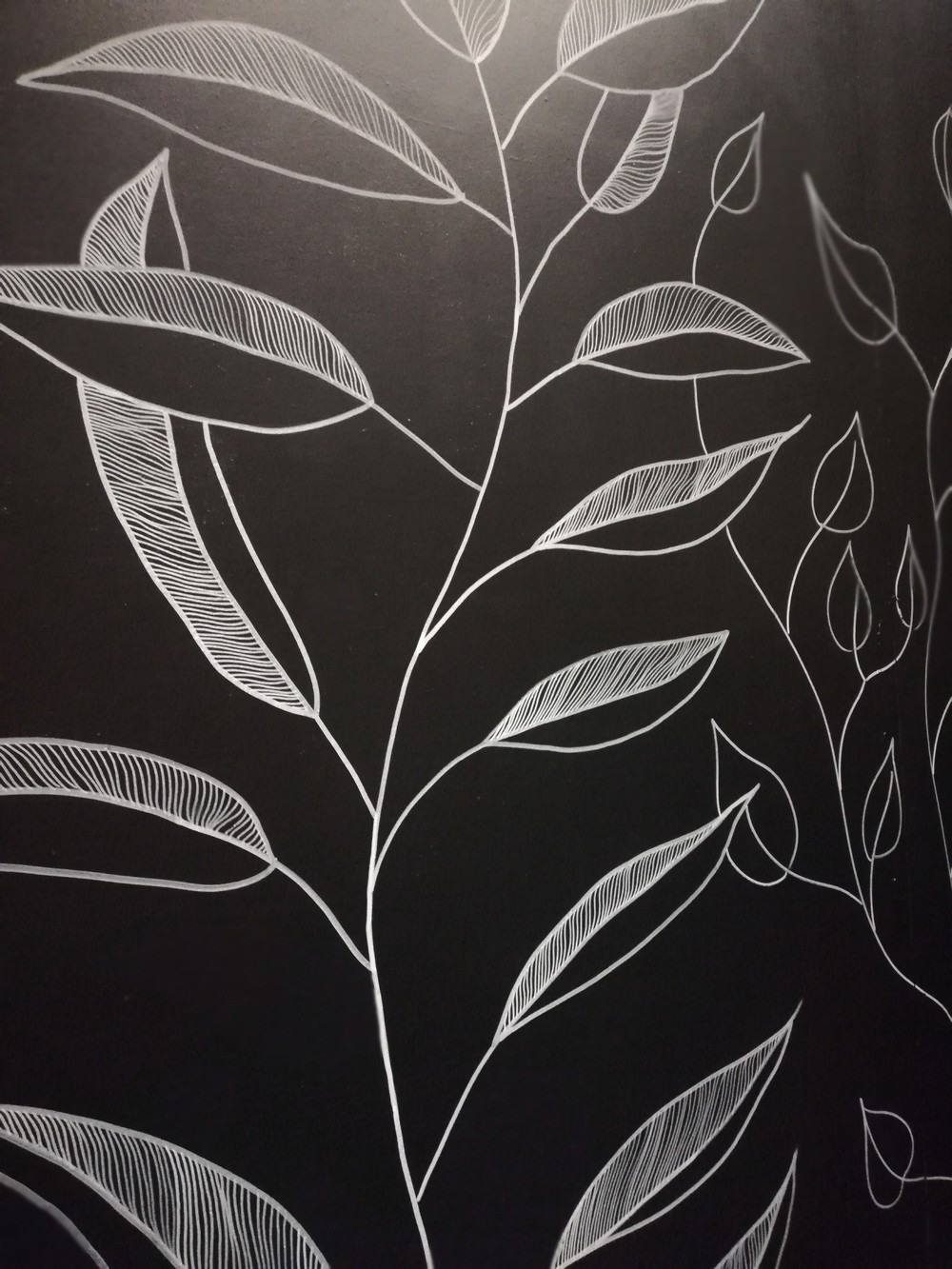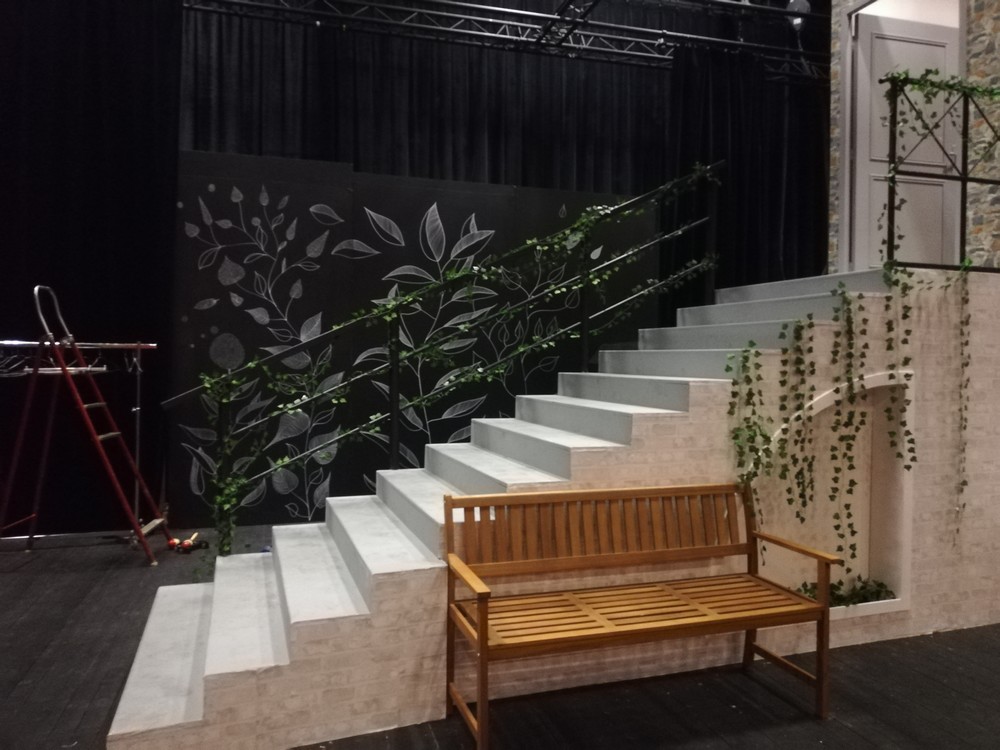 Personnalisation d’un décor de théâtre grâce à une fresque végétale au posca blanc sur le grand mur noir du fond de la scène. Place au spectacle !