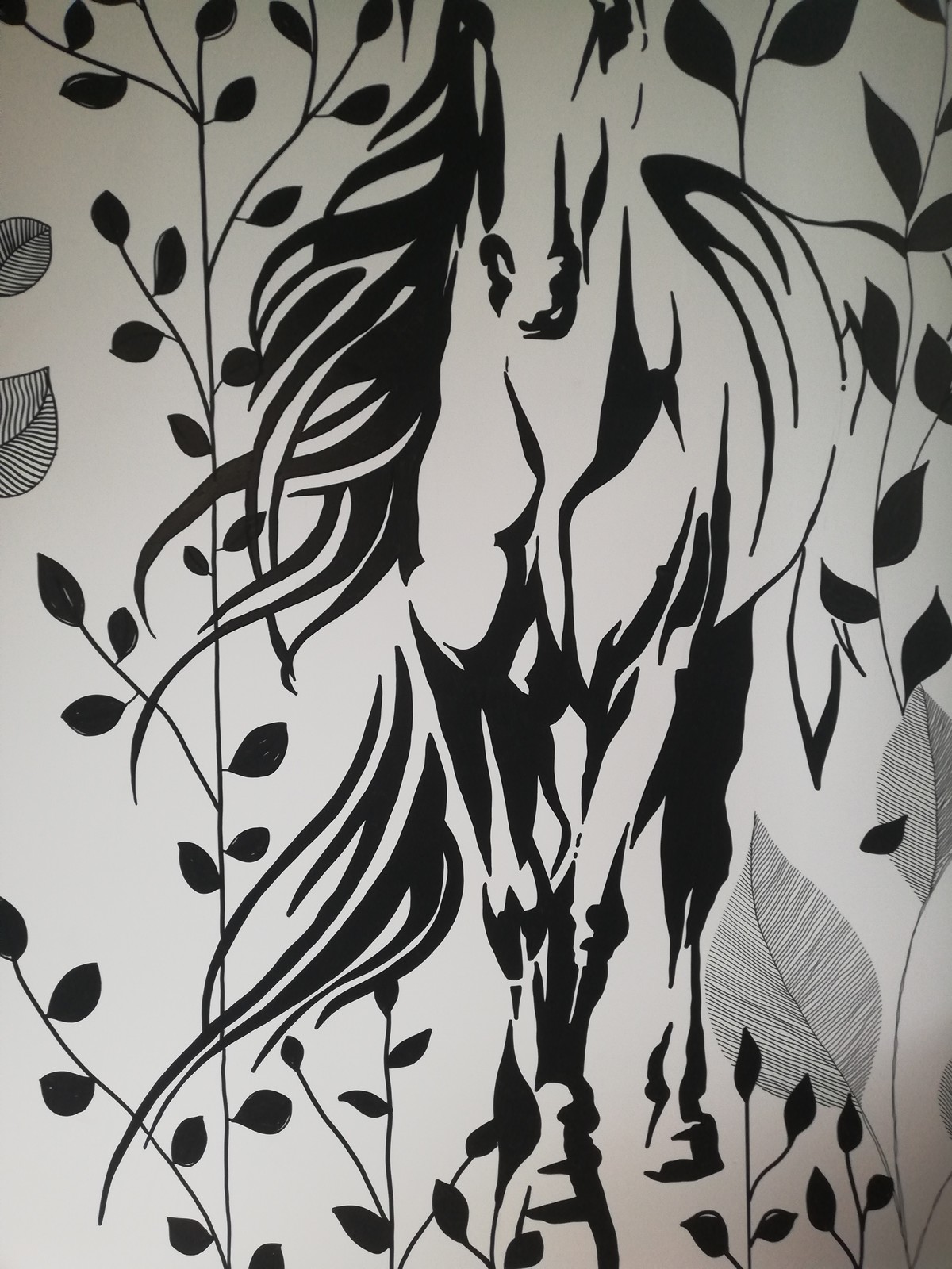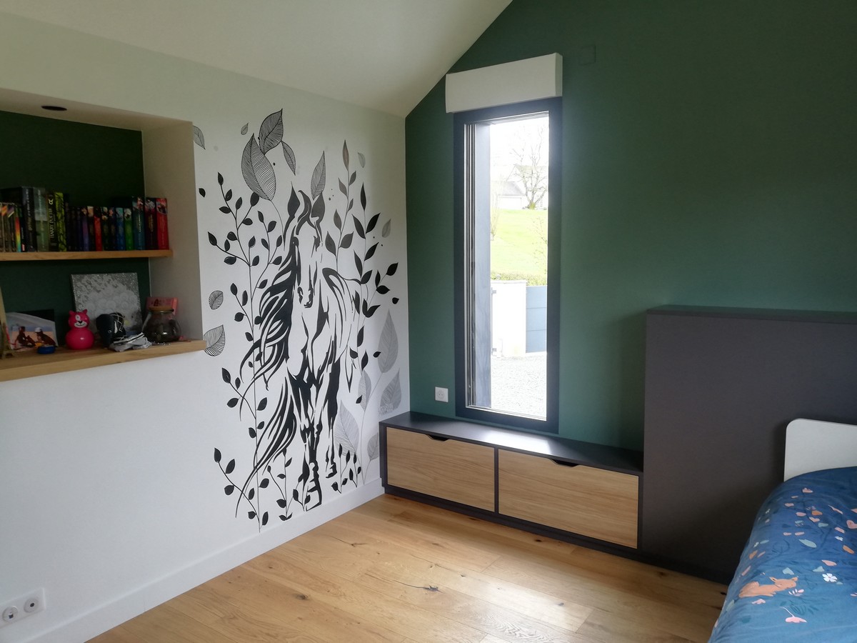 Maïa, 10 ans, est fan de chevaux. Elle en voulait dans sa chambre. Il fallait donner l’impression qu’il sorte de la végétation. Elle le voulait en noir et blanc, à dimension réelle. La fresque personnalisée permet de réaliser tous ses souhaits!