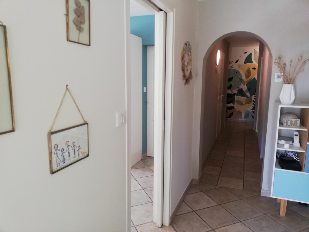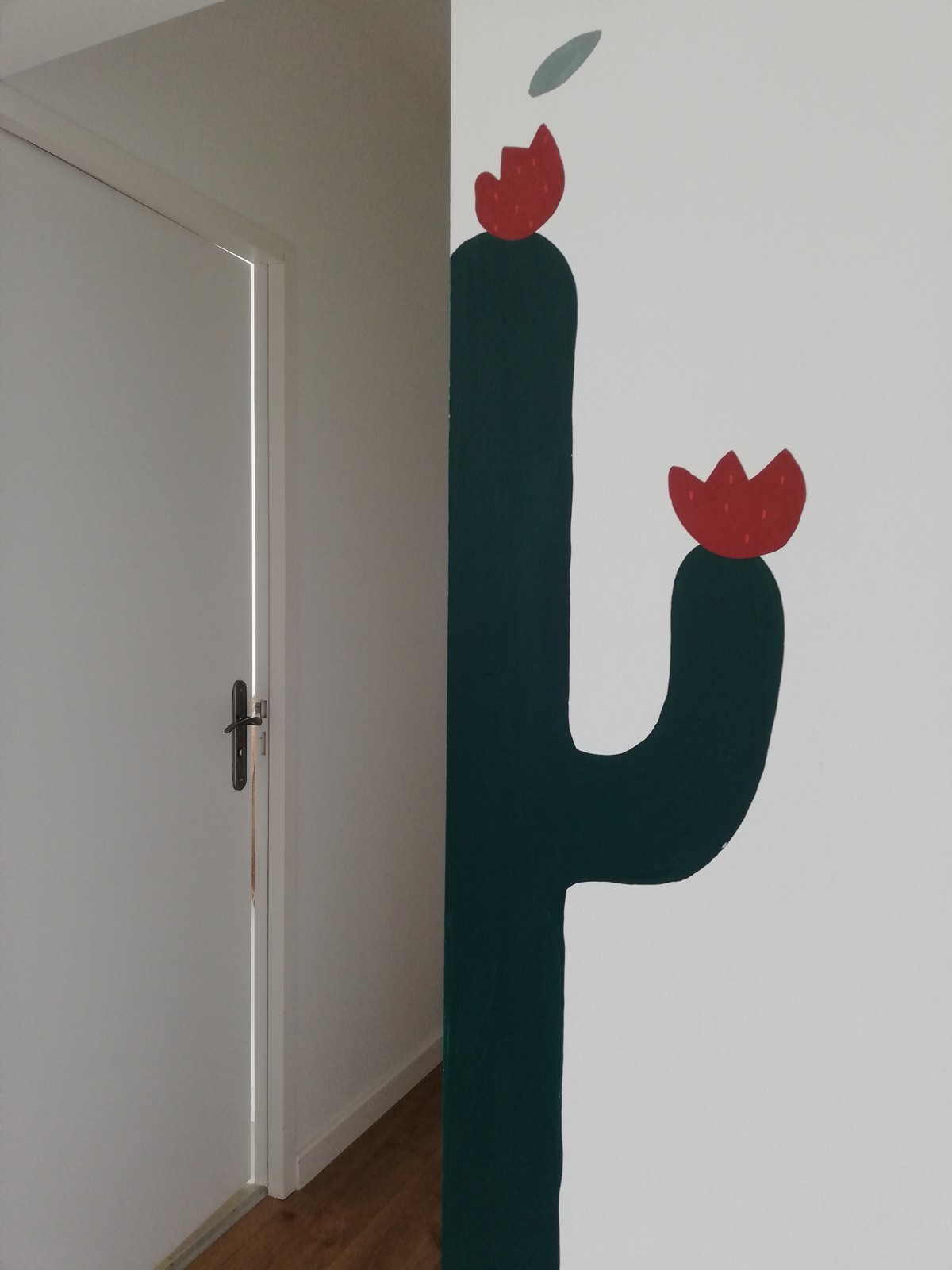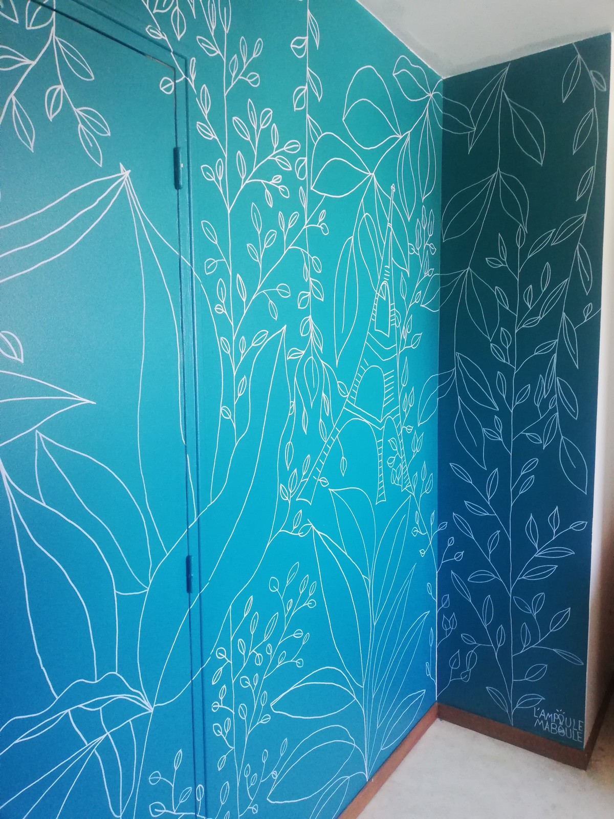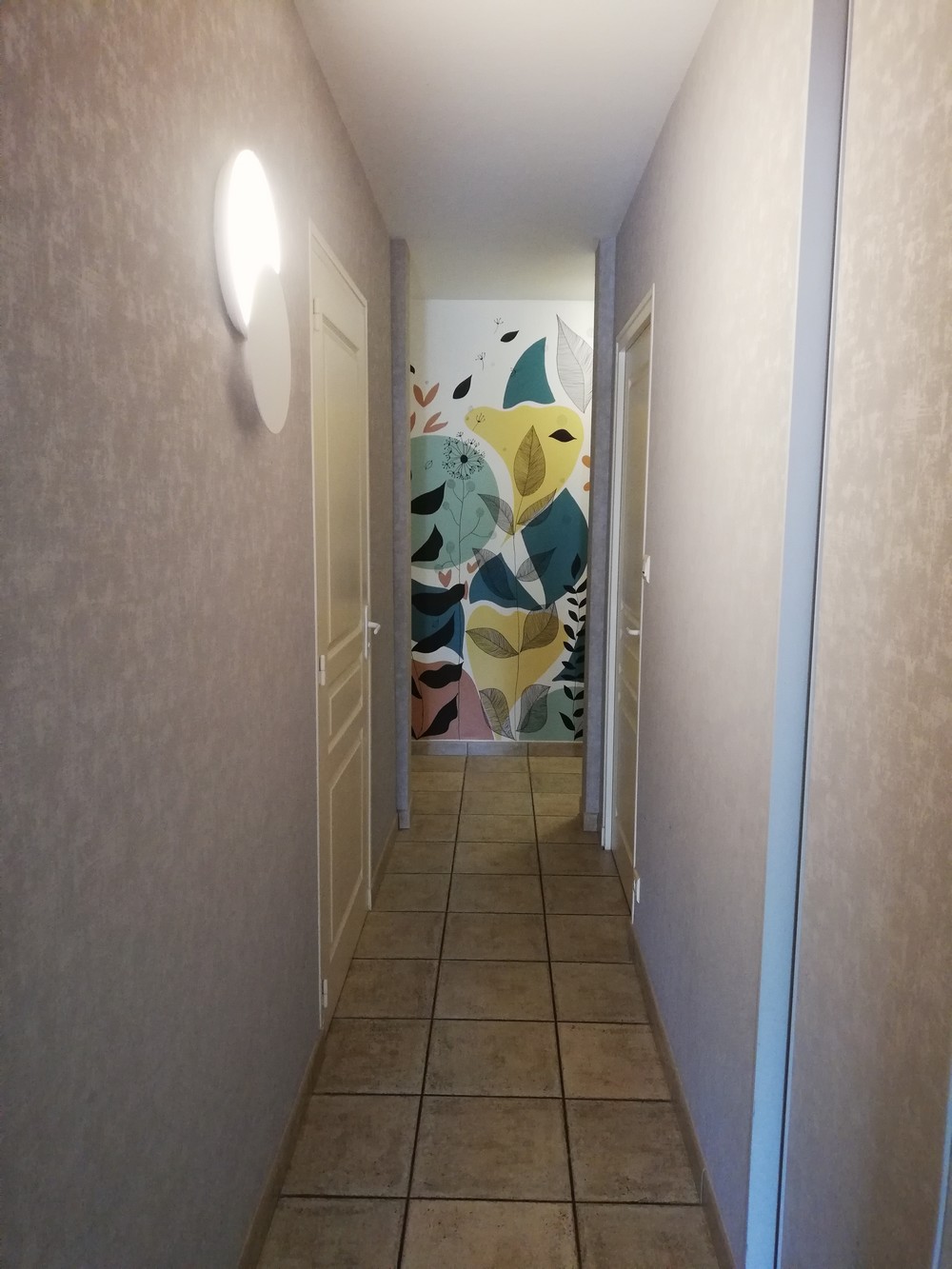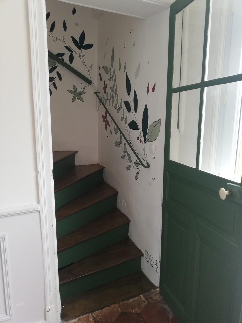 Rien de tel qu’une fresque pour illuminer un couloir que les propriétaires trouvaient trop fade, trop vide. Des couleurs marquées et un résultat que l’on voit depuis l’entrée de la maison