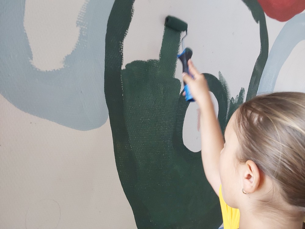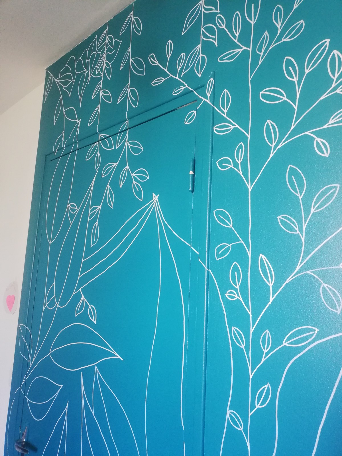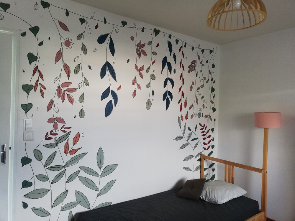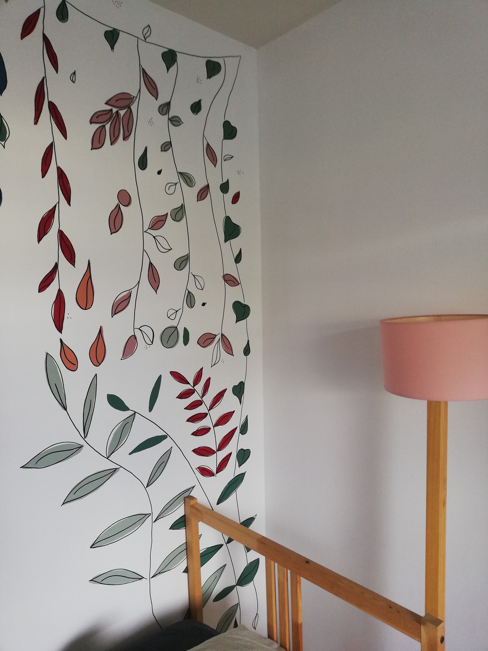 Margaux voulait une chambre de princesse avec des fleurs et feuilles magiques et colorées qui tombent sur son lit. Une journée de travail et le vœu est exaucé!