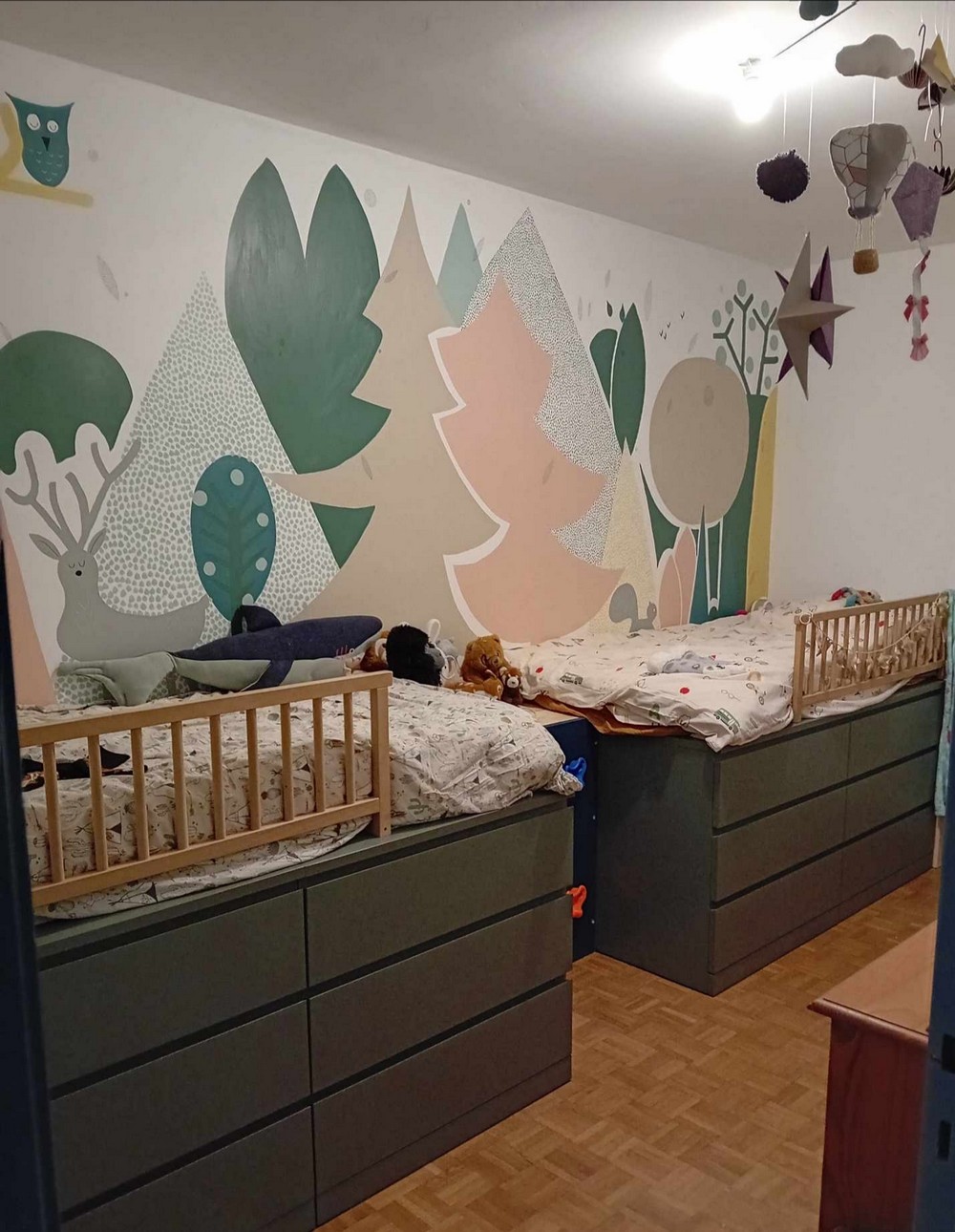 La maman de Romy et Maé a fait elle même les lits sur mesure pour ses deux jeunes enfants. Elle voulait de la couleur pour la déco et un esprit forêt magique avec des animaux des bois. Des couleurs pastels pour un univers doux et cocooning, et des feuilles qui s’envolent… Il ne reste plus qu’à écouter le bruit des arbres dans le vent avant de s’endormir!