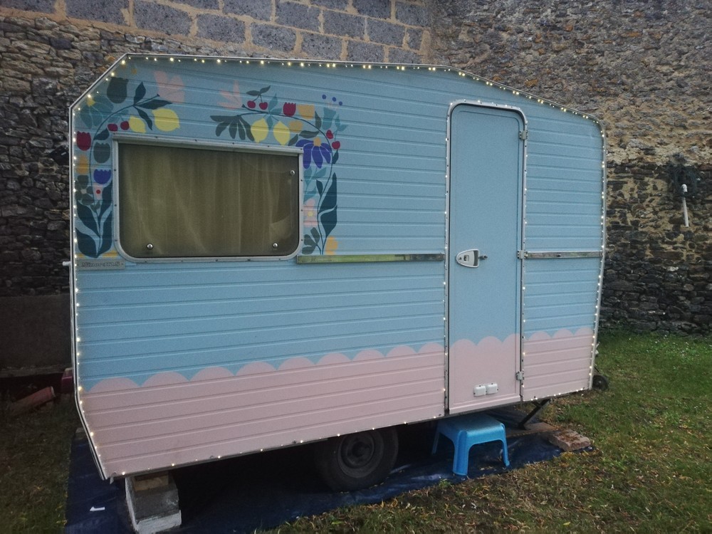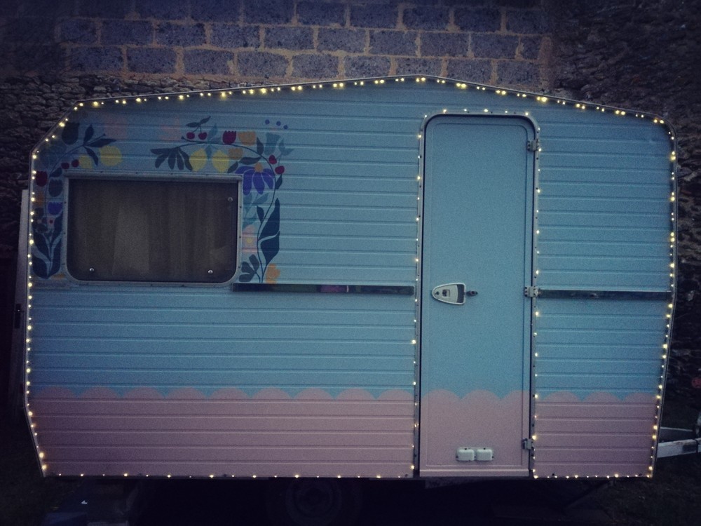 que ce soit une salle de jeux, une chambre d’amis d’été, la petite caravane blanche a été customisée et placée dans ce joli jardin! les lumières du soir lui donne un petit air guinguette qu’on adore!
