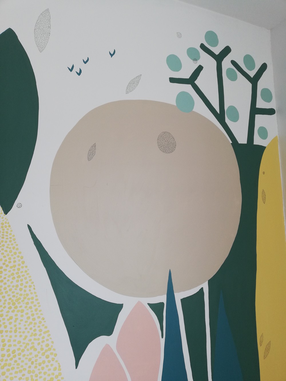 Des couleurs vives mais douces pour une ambiance cocooning et des feuilles qui s’envolent pour symboliser la petite brise qui vient caresser la joue de bébé. Dormir au pied de SON arbre, quoi de mieux ? Fais de beaux rêves petit Pablo…