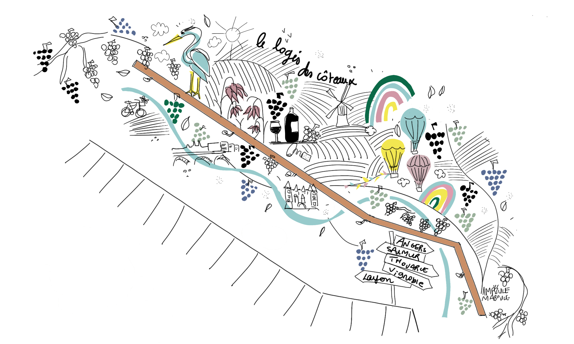 J’ai donc dessiné la Loire, ses châteaux, les montgolfières de Brissac, les champignons et les goganes que l’on trouve en forêt, un héron, une bouteille de vin, les vignes (évidemment!), un moulin cavier … que du local! L’idée est que les hôtes se souviennent longtemps de leur passage dans la région!